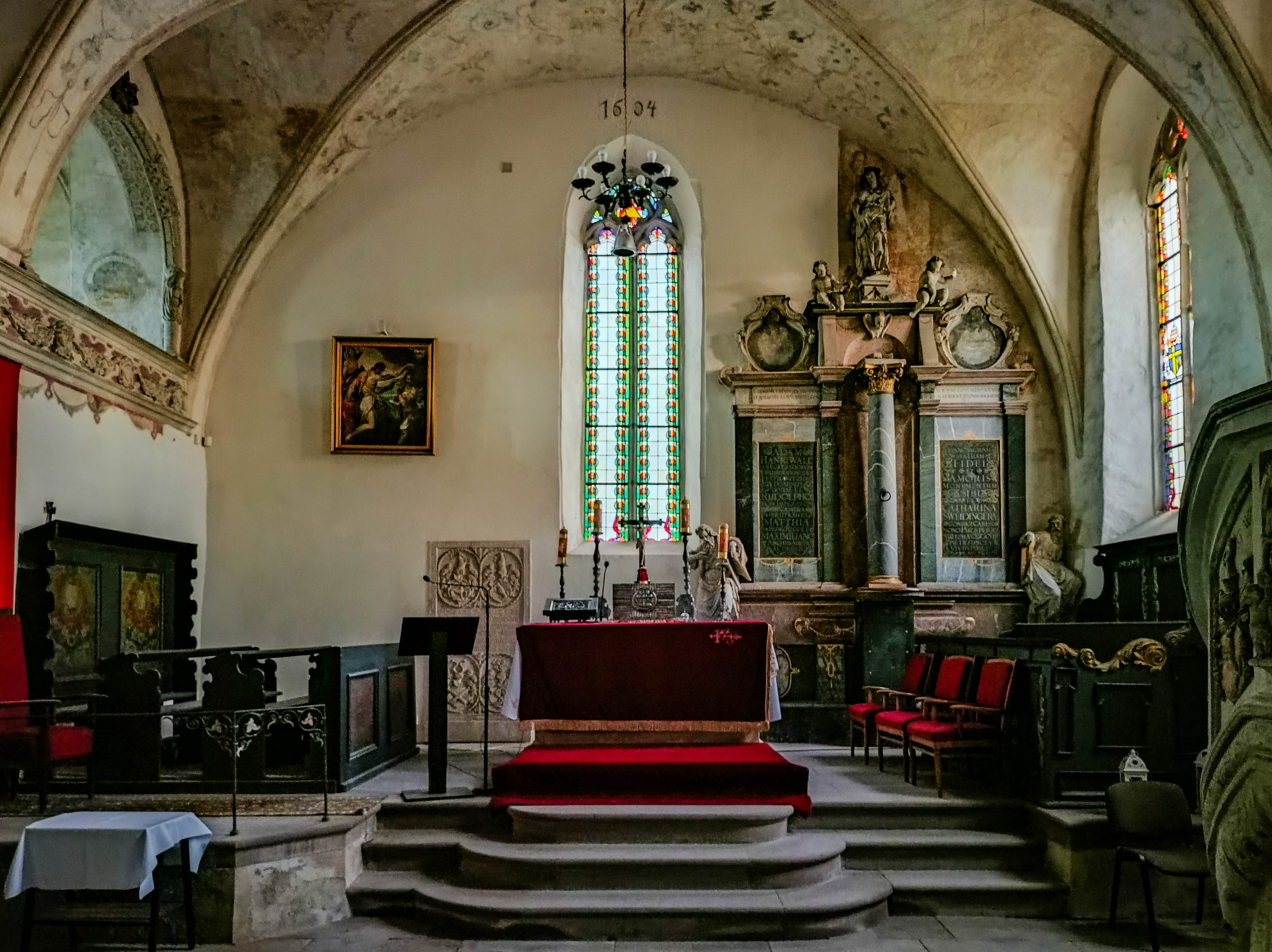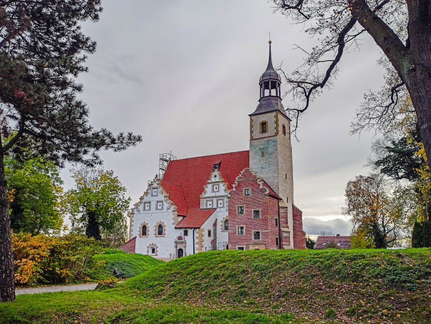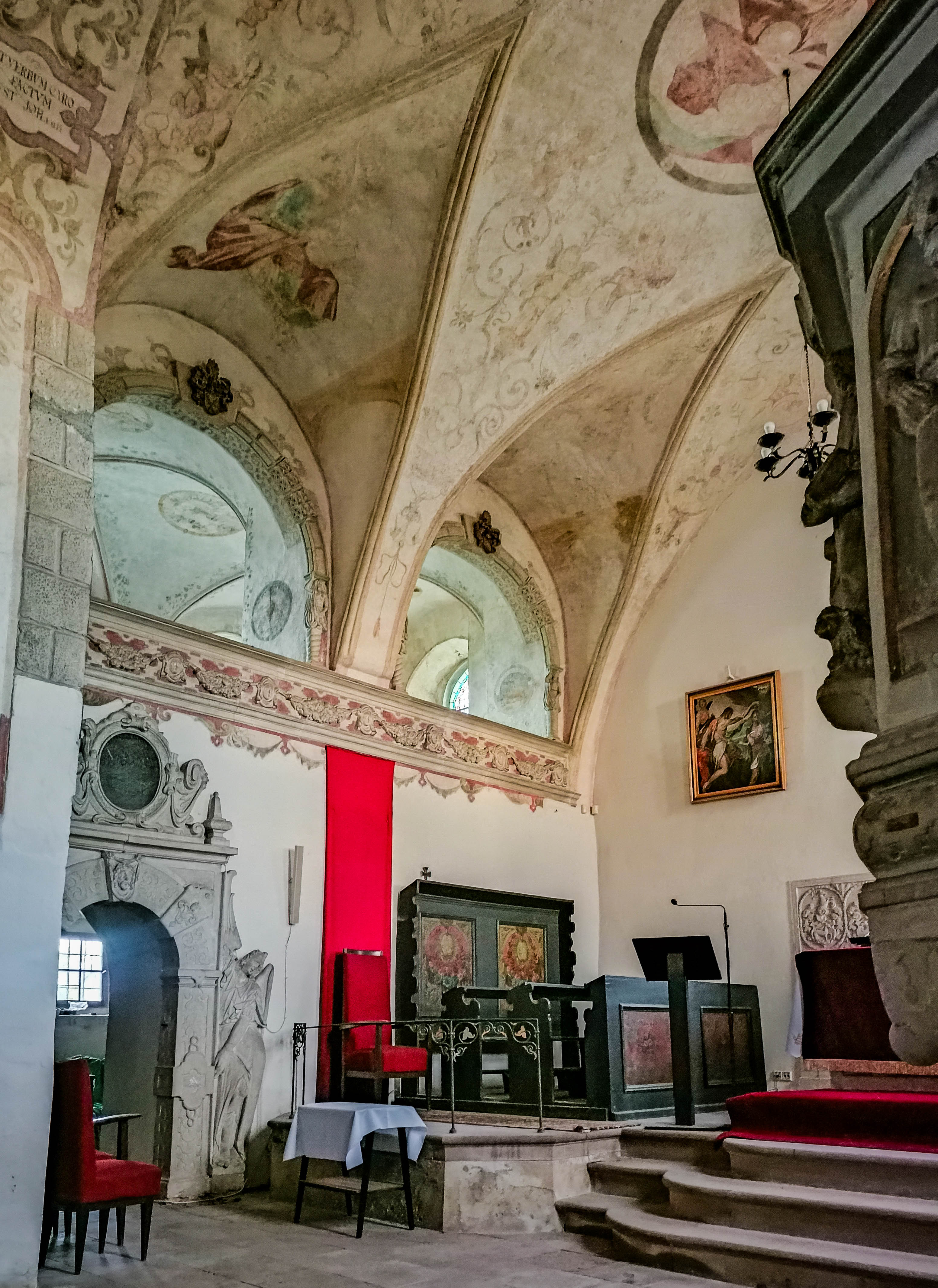 Hanniwaldtowie odpowiadają również za rozbudowanie fortyfikacji na wysepce – i choć dziś zarośnięte bastiony i wały nie robią takiego wrażenia to warto przejść się wokół kościoła. Zahaczając też o kamienną drogę krzyżową, sporo młodszą niż manierystyczna szata świątyni.
