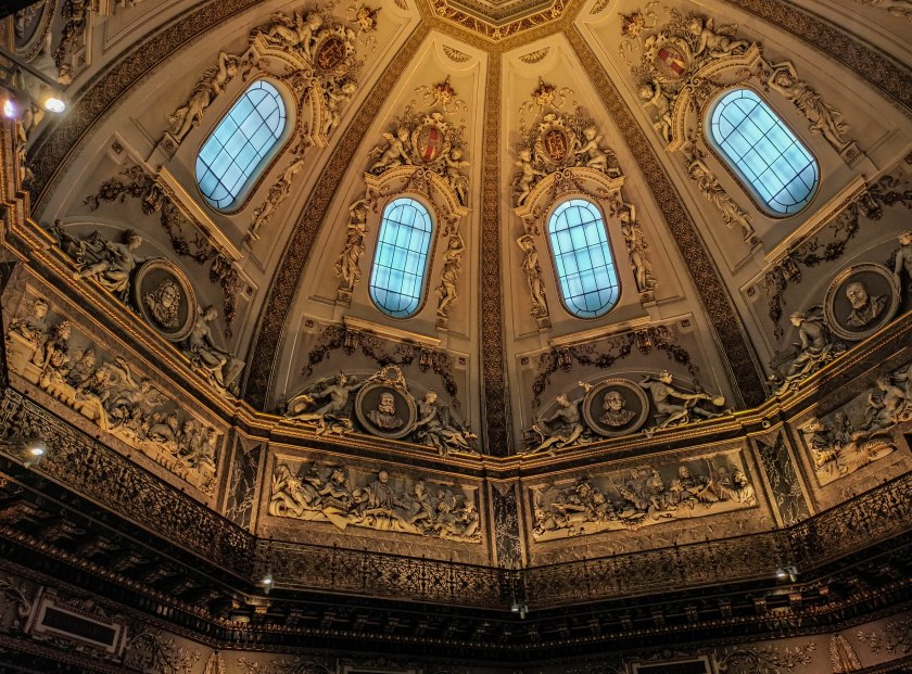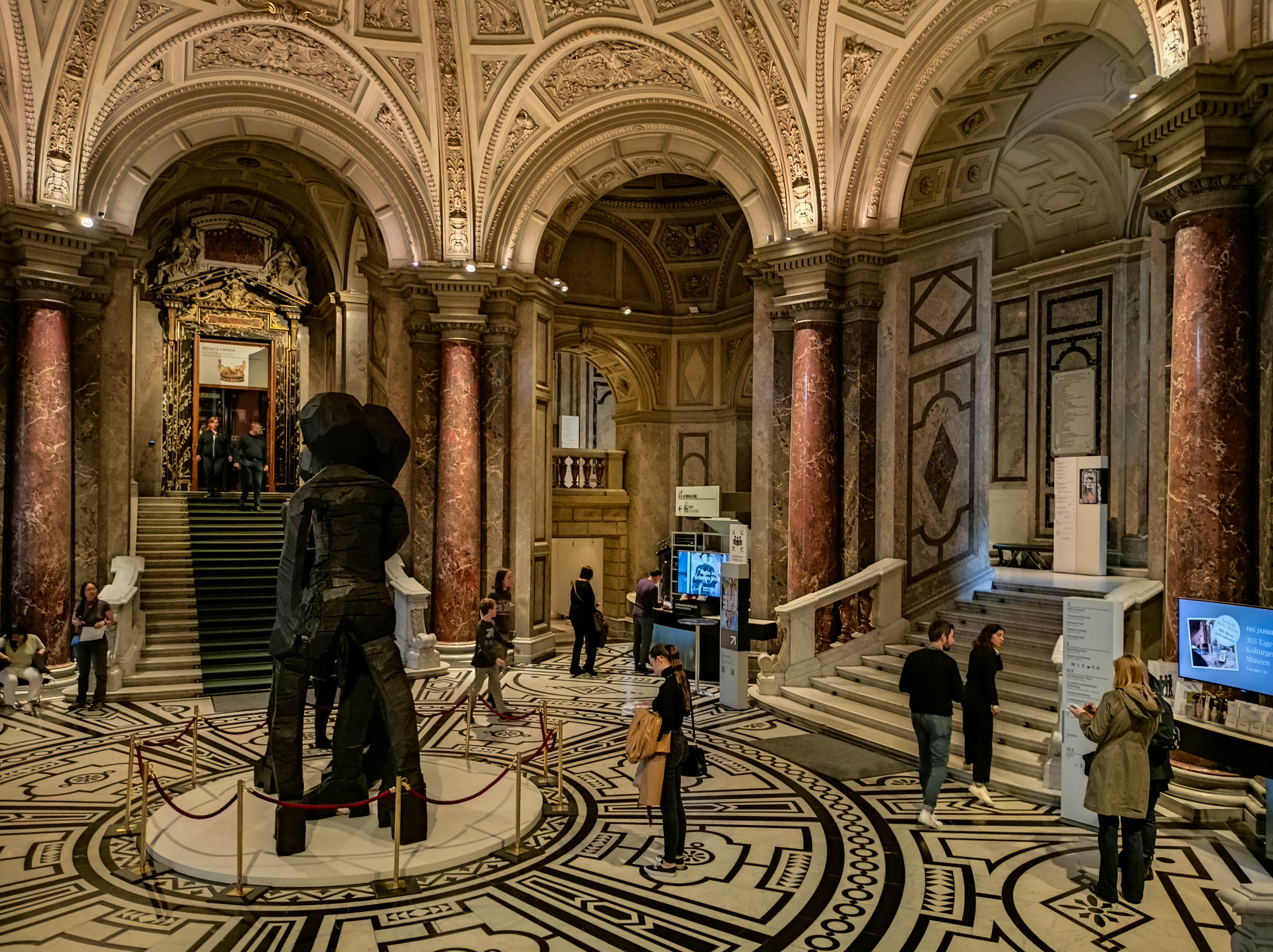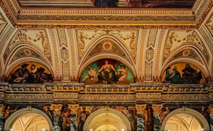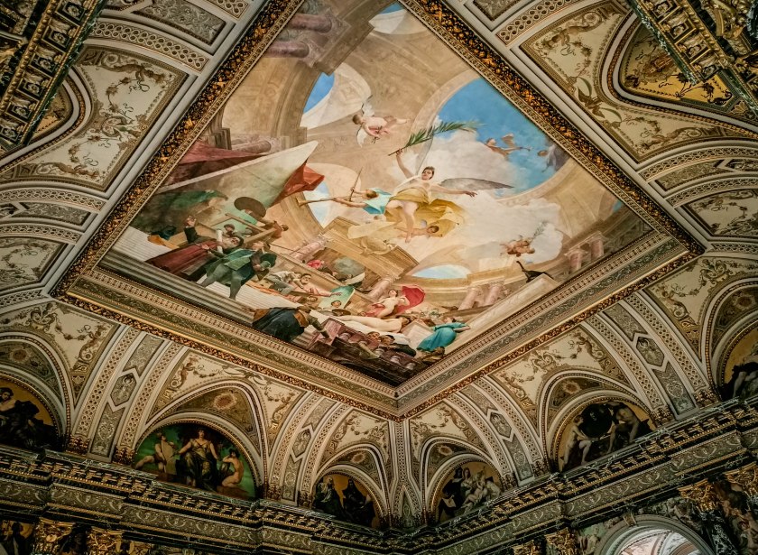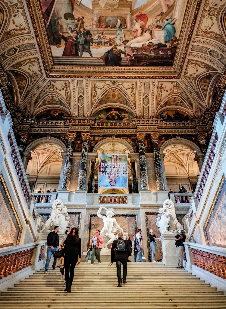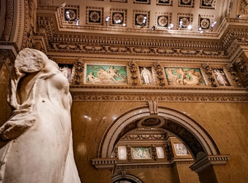 Pierwsze skrzypce gra tu marmur (biały, czarny i czerwony w przeróżnych konfiguracjach) i przebogate zdobienia ścian oraz sklepień zakończonych ukłonem w stronę chyba wszystkich habsburskich cesarzy-mecenasów, od Ferdynanda III po Franciszka Józefa I. Szczerze to na każdym piętrze przydałyby się wygodne pufy, na których można by się rozsiąść i powoli chłonąć każdy nowo odkryty szczegół – od mocarnej grupy Tezeusza poskramiającego Centaura, monumentalnej Apoteozy Renesansu po ścienne malowidła z końca XIX wieku wykonane m.in. przez młodych wówczas braci… Klimt. Tak, tych Klimtów.