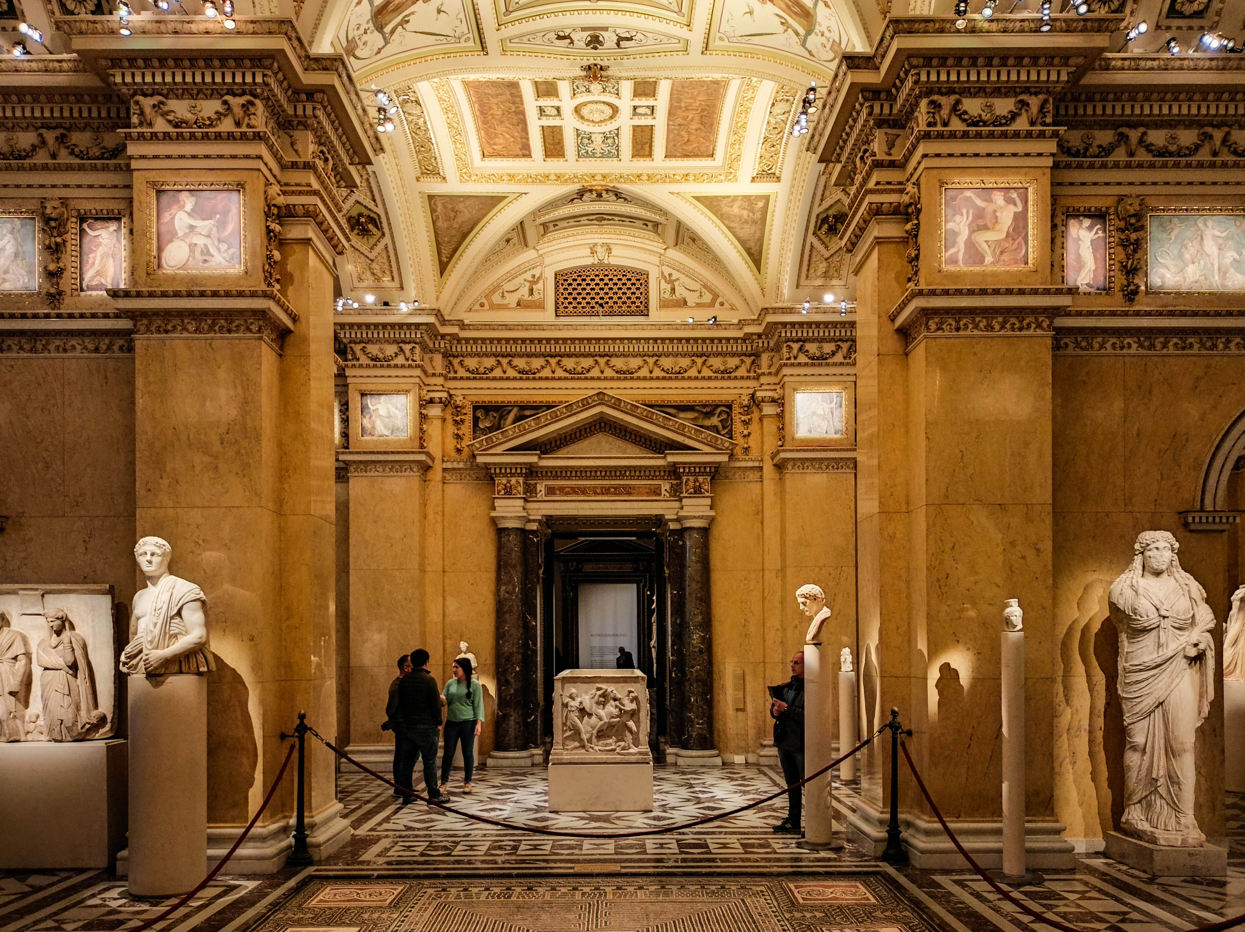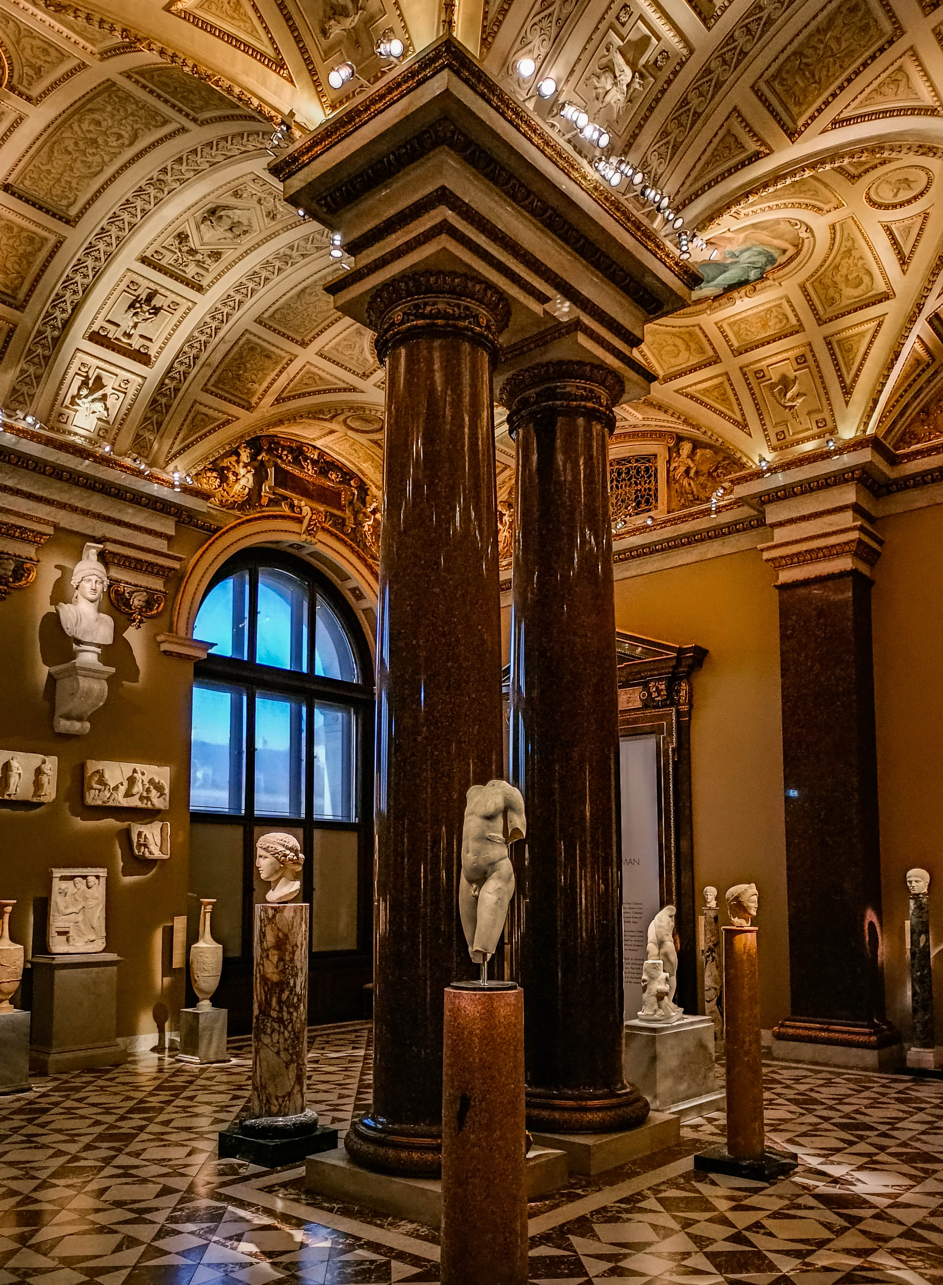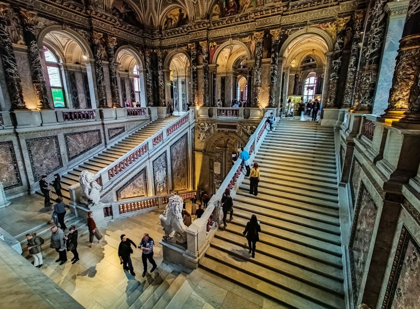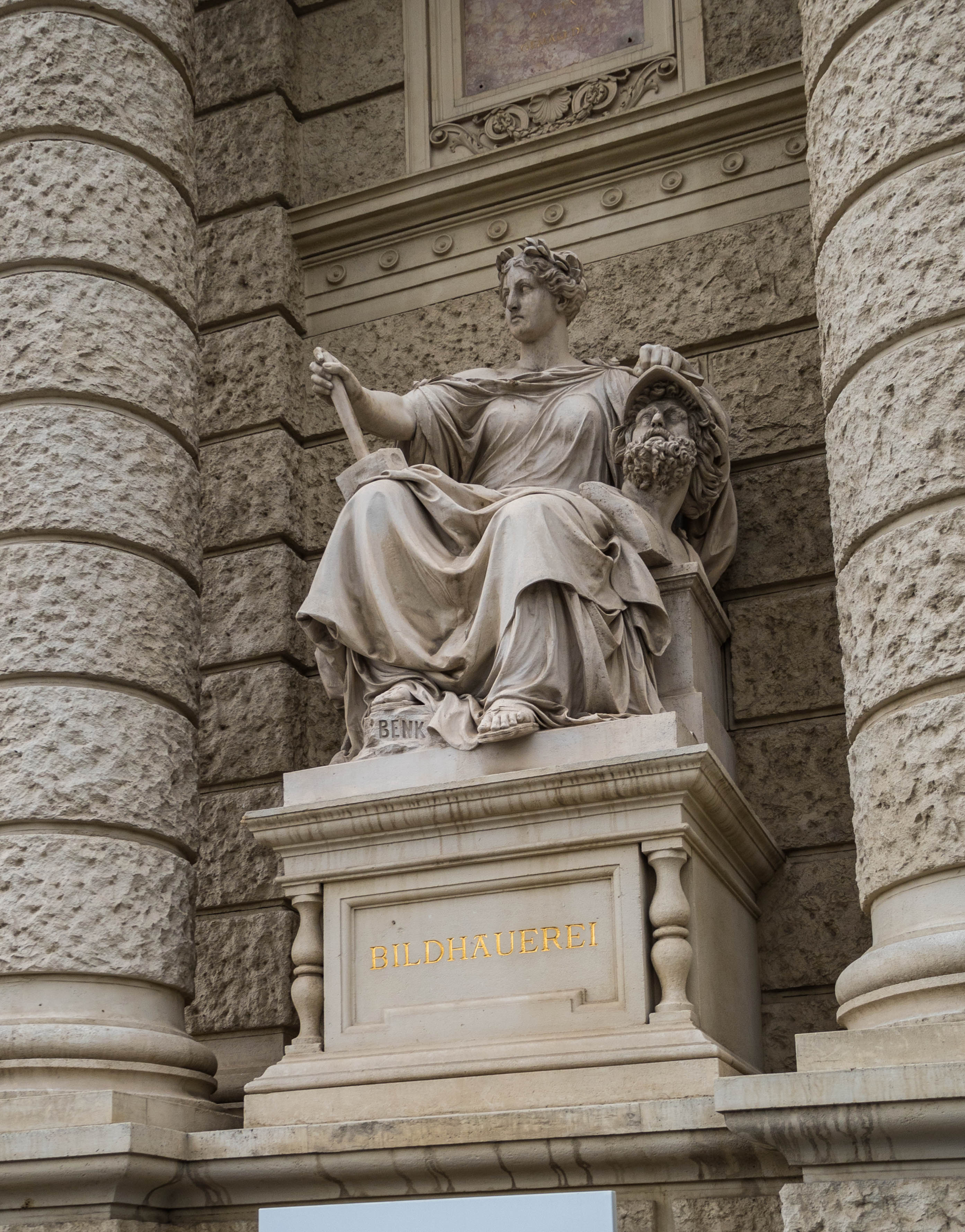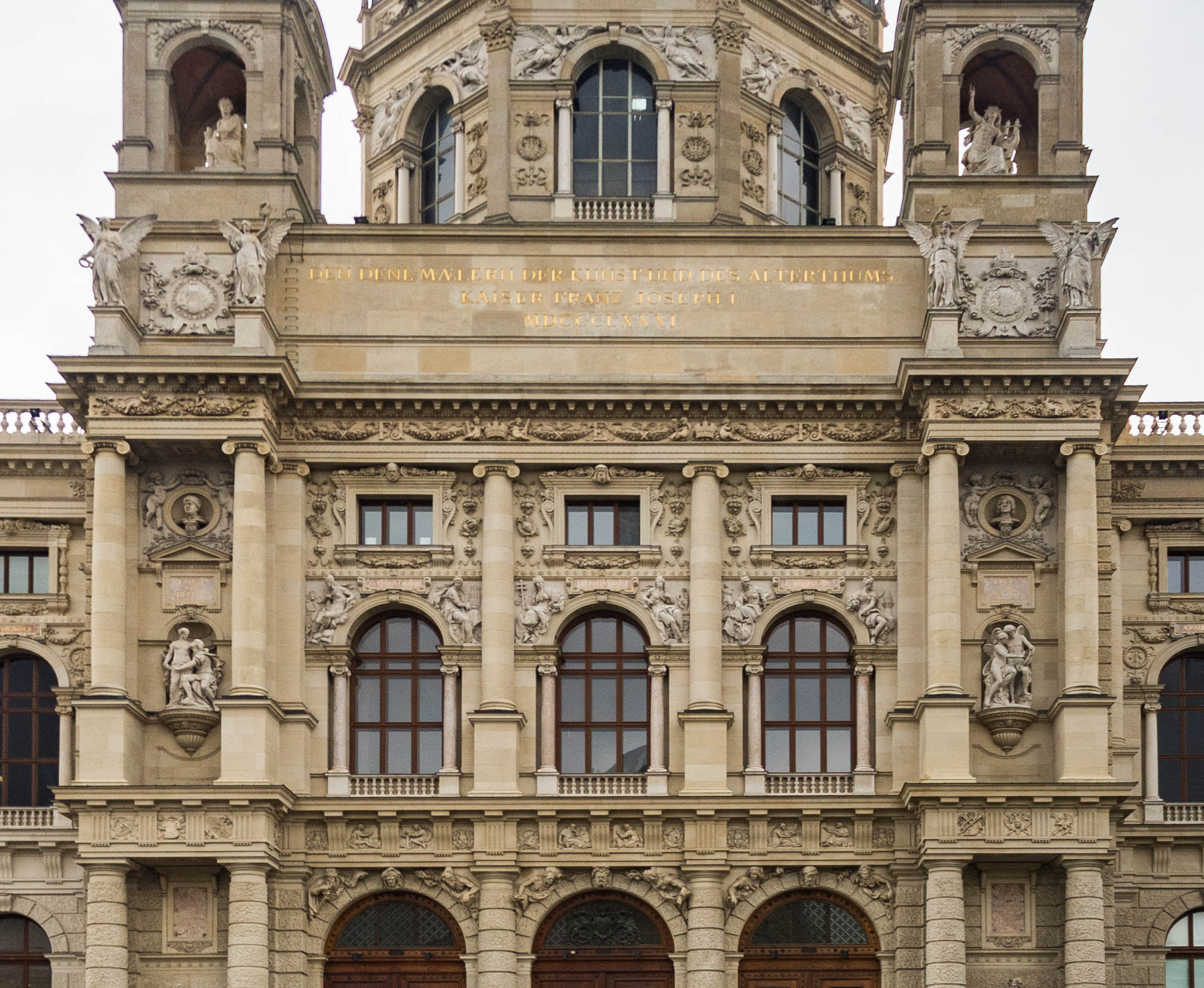 W przepastnych zbiorach każdy znajdzie coś dla siebie, ale pierwszy zachwyt – podobnie jak w przypadku bliźniaczego muzeum – spotka wielbicieli architektury. Bo olbrzymi, otwarty w 1891 roku gmach sam w sobie jest już atrakcją. Za jego budowę odpowiadają Gottfried Semper i Carl von Hasenauer, ci sami architekci, którzy stoją za MHN, dlatego jeśli podziwialiście już sąsiednie muzeum to kilka rozwiązań już was nie zaskoczy. Choć nawet, jeśli pomysł na fasadę pozostaje ten sam to i tak frapujące jest wyszukiwanie znajdujących się nań postaci, symboli, alegorii. Śmietanka niemieckich i austriackich rzeźbiarzy naprawdę się postarała.