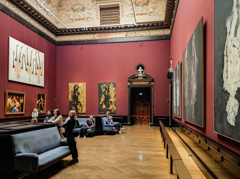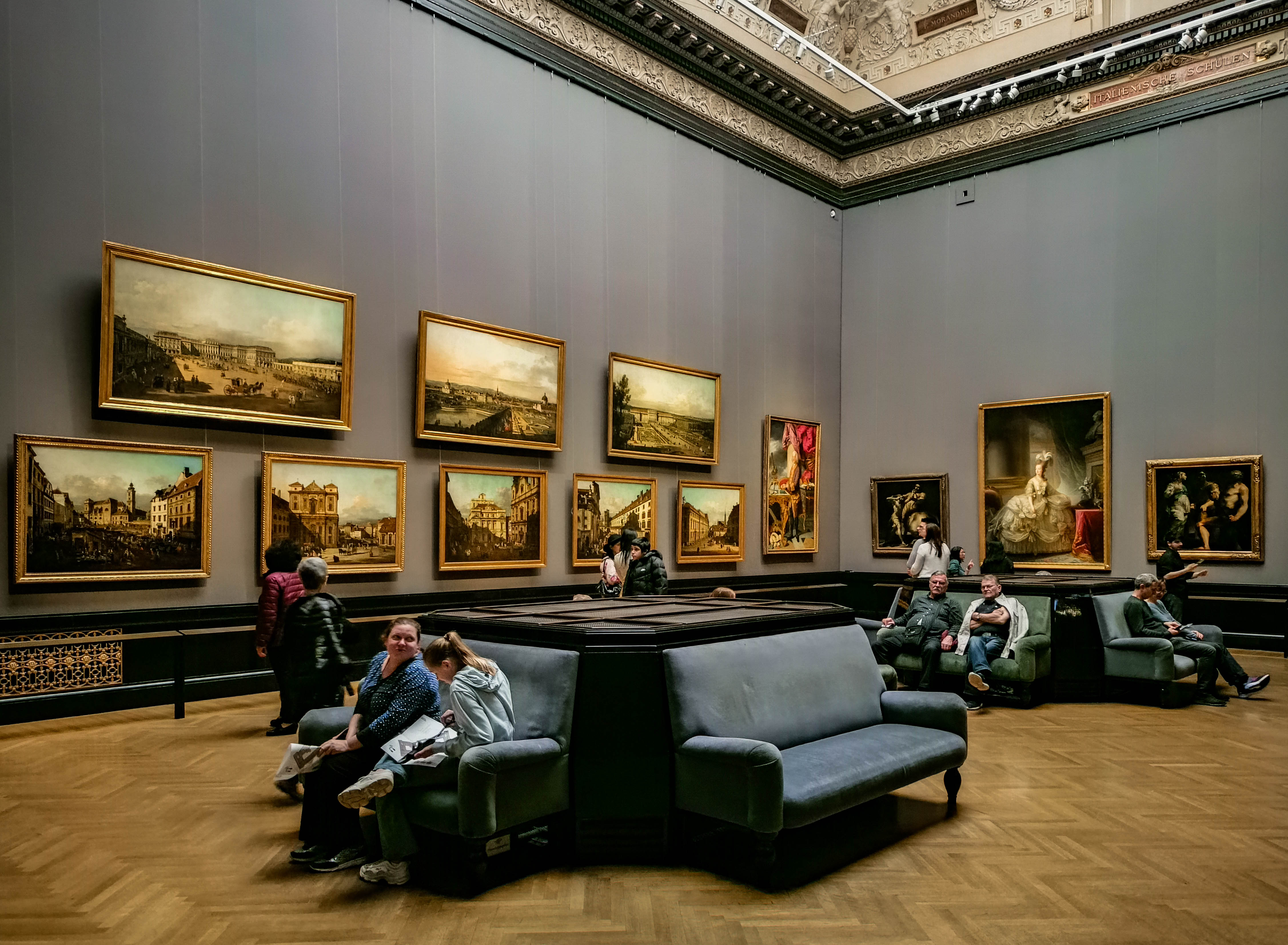 I choć zbiory owej sztuki są tu absolutnie oszałamiające to jej nagromadzenie potrafi wyczerpać. Jak znalazł są wtedy sofy, na których można usiąść i odetchnąć. Lubię sobie wtedy posłuchać jak skrzypi podłoga, poobserwować ludzi i to jak zwiedzają, czy szybko, wolno, w skupieniu, roztargnieniu, z telefonem w ręku, z przewodnikiem, rozmawiając, w ciszy, czy nawet rysując…
