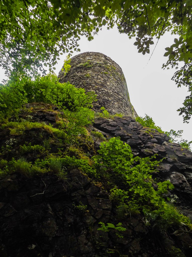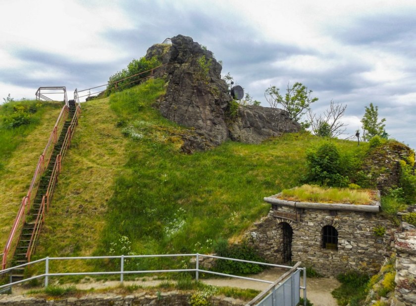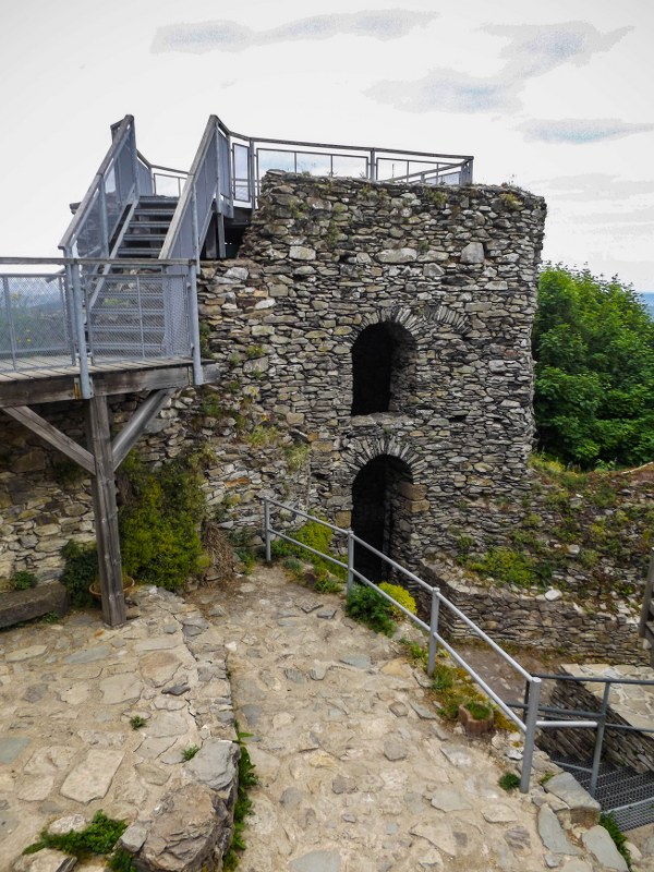 Czy z zamku zostało wiele? Nie jest to szczyt marzeń, no ale nie wybrzydzajmy. Mamy kawał murów tarczowych, spory fragment wieży artyleryjskiej (potężnej :O), dwie wieże podkowiaste, część zabudowań bramnych. I pomiędzy nimi wszystkimi tonę żelastwa, które jakby nie było pomaga się między każdą częścią poruszać zapewniając bezpieczeństwo. Prowadząc też na kapitalne punkty widokowe. Jeden znajduje się na wieży a drugi na reliktach (niemalże już niedostrzegalnych) najstarszego zamku na samiuśkim wierzchołku. I stamtąd też roztaczają się najlepsze widoki!