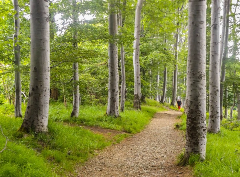 Pierwsze dwa kilometry w bukowym lesie to płaska i niewymagająca powtórka z rozrywki. Słońce dość szybko schowało się za chmurami, a te choć przez pół dnia wisieć będą posępnie nie przyniosą deszczu. W miejscu gdzie poprzedniego dnia skręciliśmy w stronę Luža kontynuujemy marsz żółtym szlakiem po chwili osiągając drogę krajową nr 9.