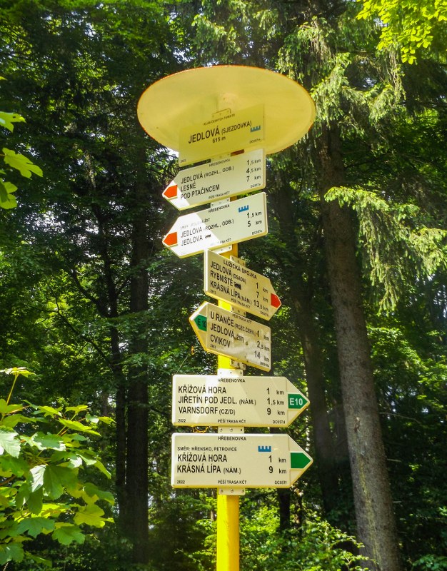 A my cóż, po spędzeniu na szczycie dłuższej chwili, wpałaszowaniu dobrej zupy czosnkowej i zobaczeniu każdego punktu widokowego ruszyliśmy dalej. Szlak czerwony biegnie wzdłuż północnego zbocza Jedlovej przez chwilę towarzysząc rozbieranemu na lato wyciągowi narciarskiemu, po kilometrze spotykając się z zielonym schodzącym dalej do Jiretina pod Jedlovą. Was w tym miejscu pożegnamy a z niepozornym miasteczkiem i jego ciekawostkami spotkamy się następnym razem. Mam nadzieję, że ta część spaceru wam się spodobała i Jiretin jako podwieczorek okaże się idealnym jego domknięciem.