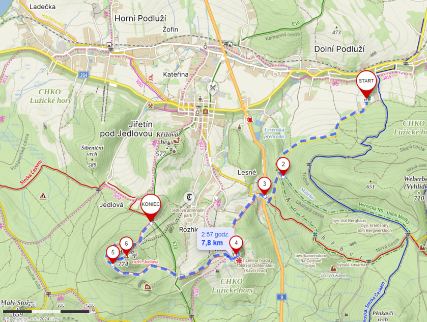 • Dystans w jedną stronę: 7,1 km. Następnie zejście do Jiretina pod Jedlovą: 1,3 km.