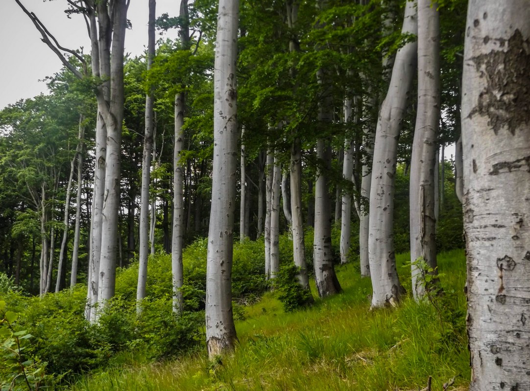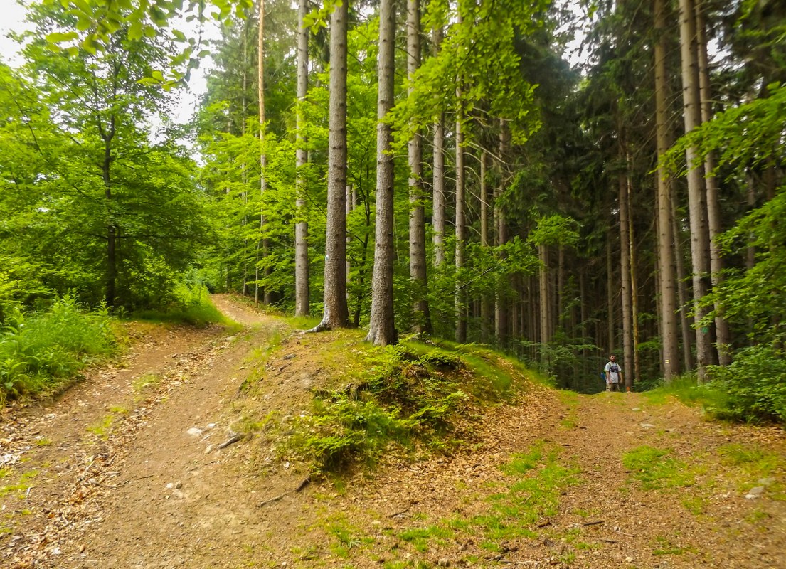Pierwsze dwa kilometry w bukowym lesie to płaska i niewymagająca powtórka z rozrywki. Słońce dość szybko schowało się za chmurami, a te choć przez pół dnia wisieć będą posępnie nie przyniosą deszczu. W miejscu gdzie poprzedniego dnia skręciliśmy w stronę Luža kontynuujemy marsz żółtym szlakiem po chwili osiągając drogę krajową nr 9.