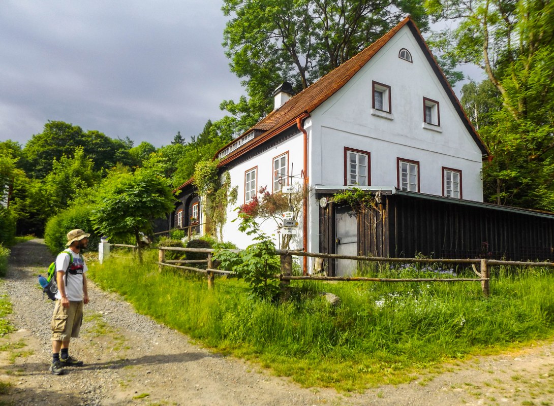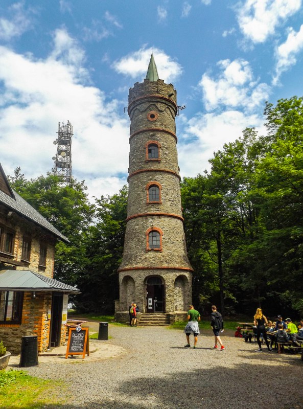 Mimo wspomnianego asfaltu Jedlová to bardzo wdzięczny temat górskiej łazęgi a duża w tym zasługa karczmy oraz kamiennej wieży widokowej. Tak chata jak i wieża powstały pod koniec XIX wieku podczas turystycznego boomu, kiedy to czeskie czy niemieckie Towarzystwa Górskie za punkt honoru stawiały sobie wytyczanie szlaków na każdy pagór a następnie wznoszenie infrastruktury pomocnej piechurom chcącym owe szczyty zdobywać. I wielkie im za to dzięki, bo gros ich roboty służy nam do dziś… choć po drodze nie zawsze było lekko – i wieża i chata na przestrzeni dziesięcioleci popadły w ruinę i dopiero pod koniec lat 90. ubiegłego wieku przywrócono im dawny blask. I tu też dostajemy odpowiedź na pytanie: co w tak urokliwym miejscu może robić asfalt.