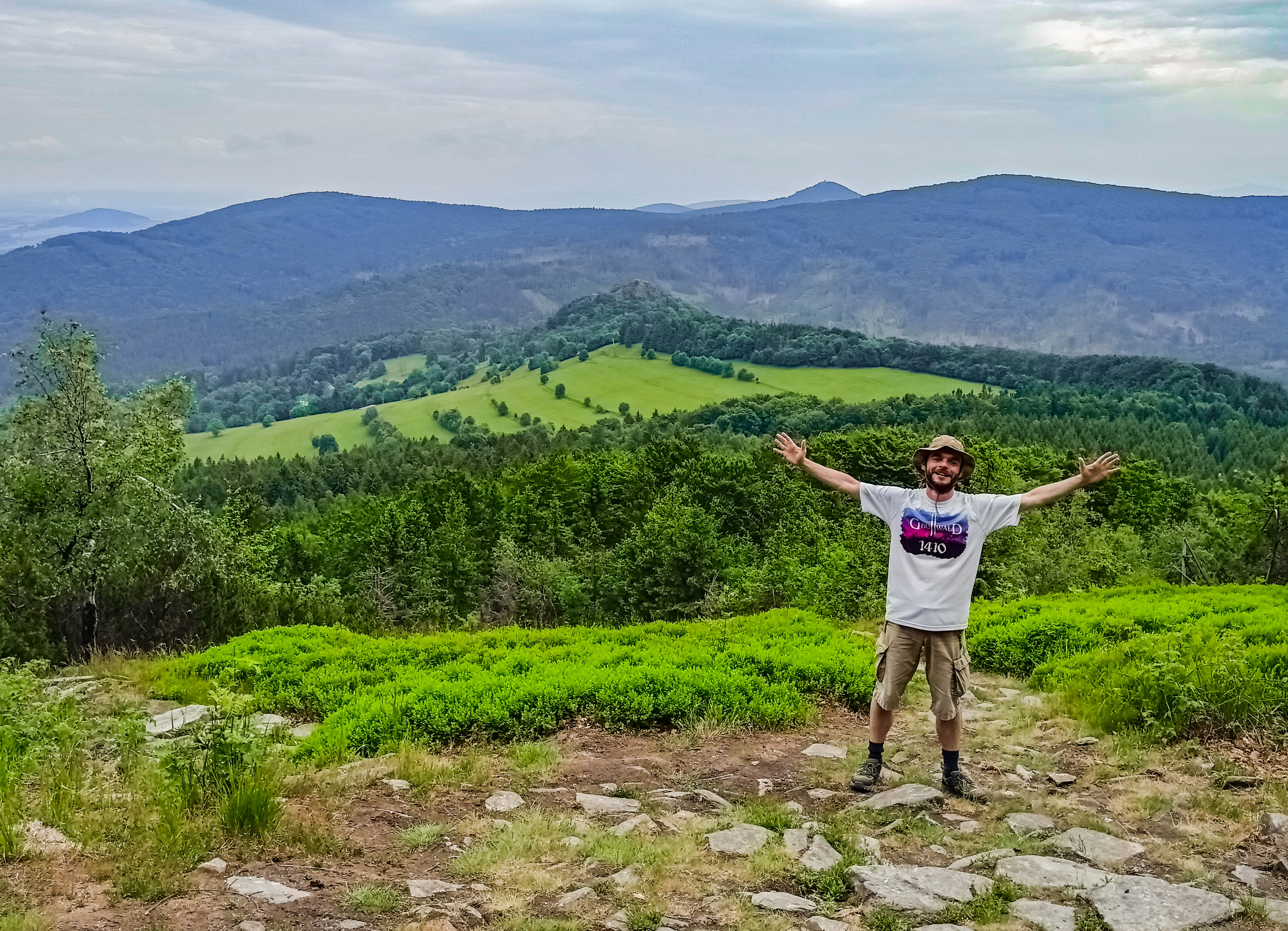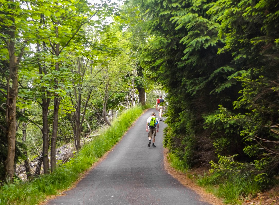 Wracając do spaceru: na kilometr przed wierzchołkiem leśna ścieżka zmienia się w nemesis wszystkich górskich piechurów, asfalt. Drzewa się przeradzają i na chwilę otwiera się kapitalny widok na południową część gór Łużyckich. Tam też przy niewielkiej wiacie traficie na rozejście szlaku: skręcając w prawo kontynuować będziecie marsz na szczyt; skręcając w lewo zaczniecie zejście do Jiretina pod Jedlovą.