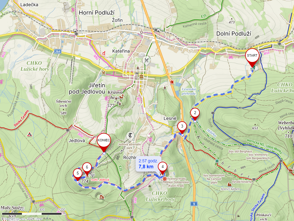 • Dystans w jedną stronę: 7,1 km. Następnie zejście do Jiretina pod Jedlovą: 1,3 km.