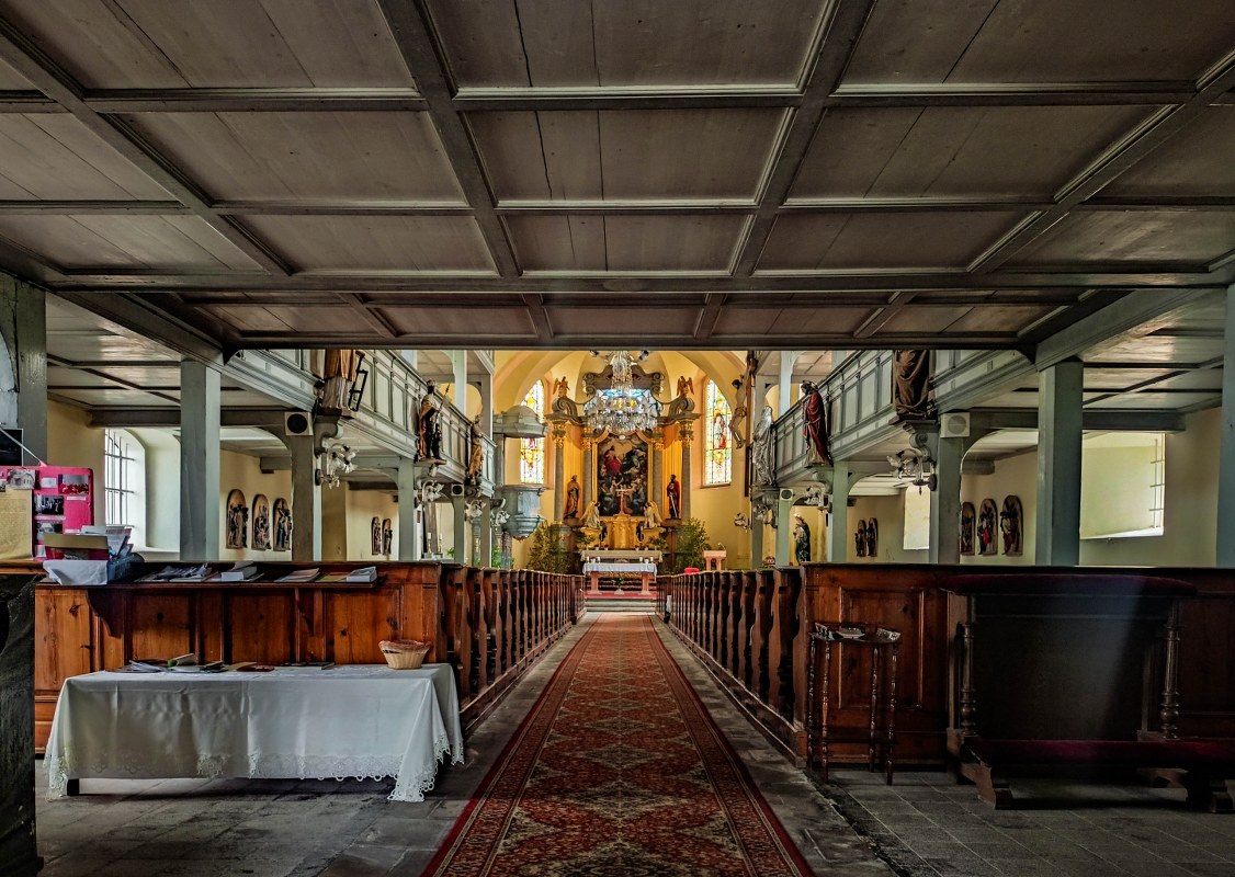 Górujący nad placem kościół Świętej Trójcy jest niemal tak samo stary jak miejscowość. Budowa renesansowej świątyni rozpoczęła się kilkadziesiąt lat po lokacji miasta a już na początku XVII wieku odprawiono pierwsze msze. O protestanckim rodowodzie świątyni świadczą drewniane empory, dwa ich pietra! Podoba mi się, że silnie drewniane wnętrza nie straciły swojego uroku, choć pewnie po drodze w fazie zbarokizowania chciano upchać tam trochę nadliczbowego wyposażenia.