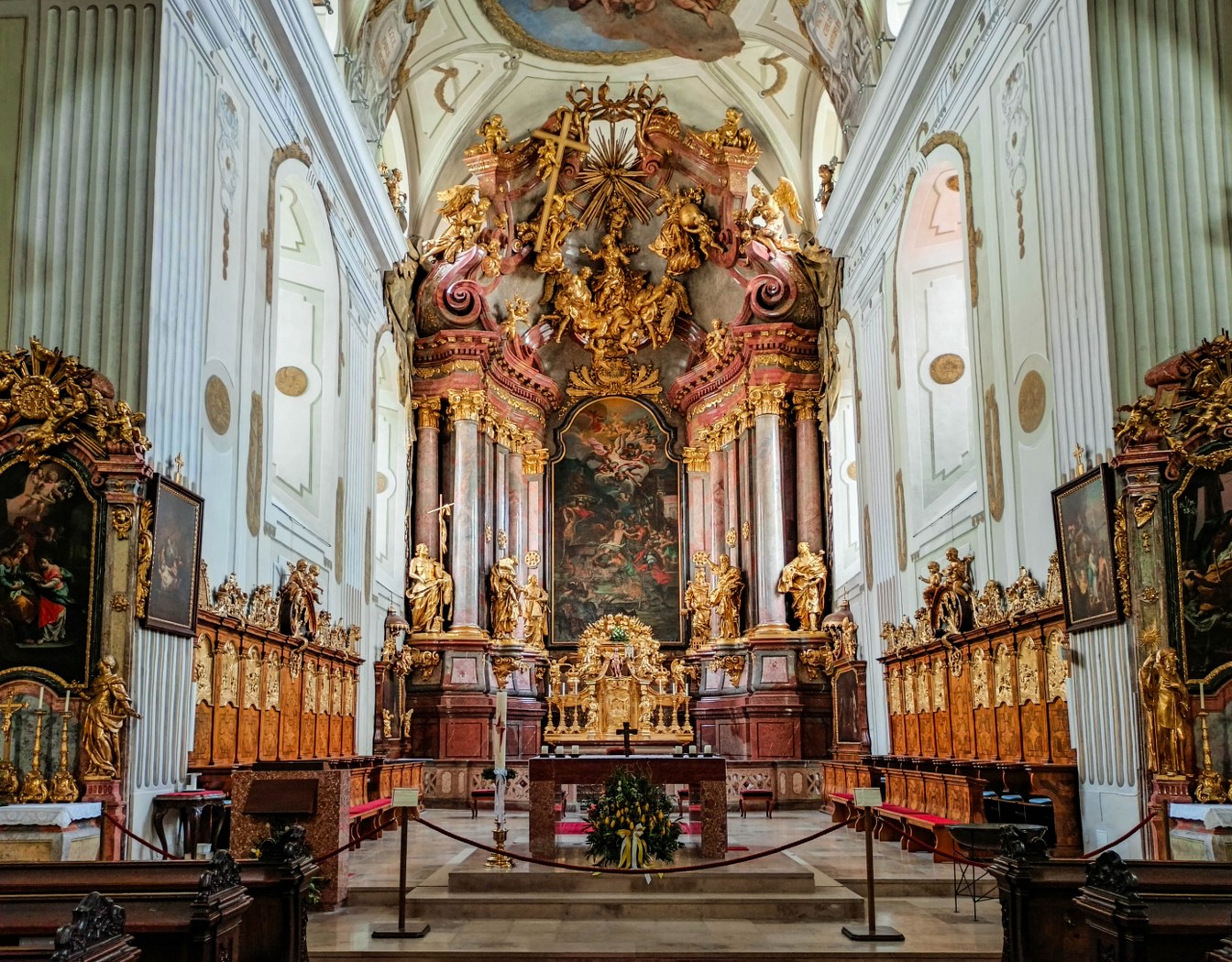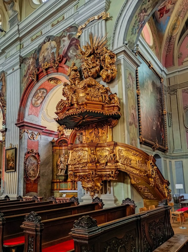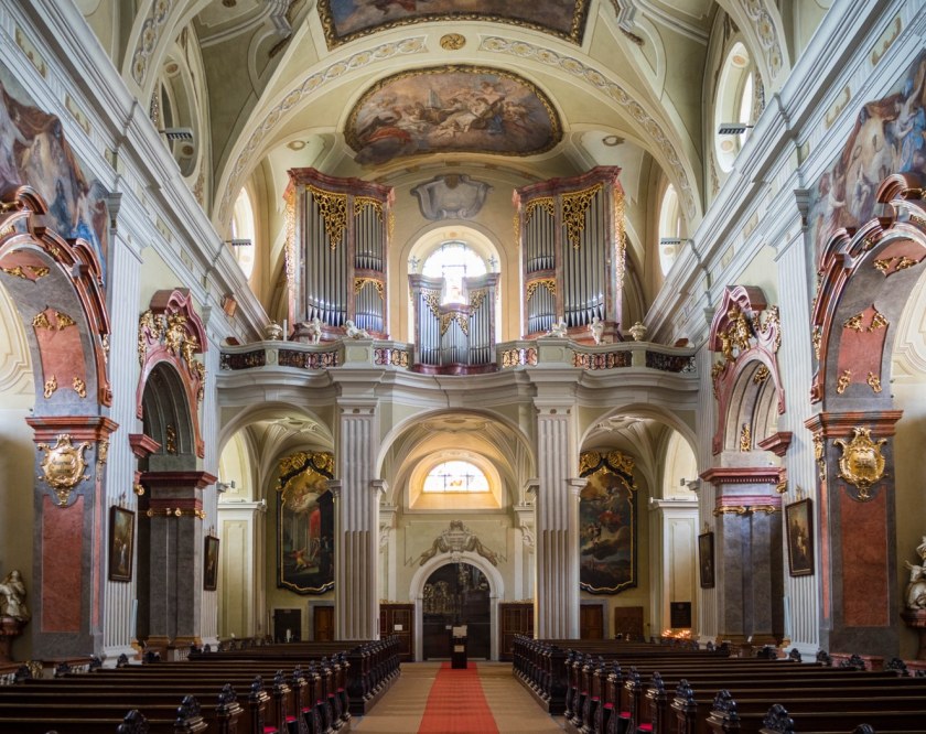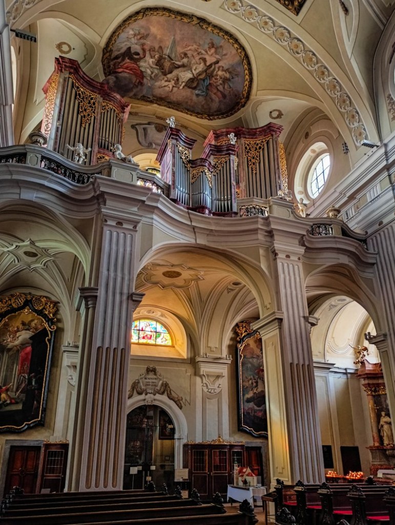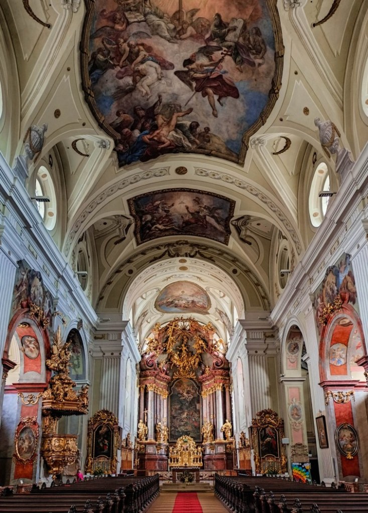 Chętnych na prawdziwie barokowy zawrót głowy zapraszam do środka – olśniewających wnętrz jako żywo mogłaby pozazdrościć niejedna wiedeńska świątynia! W powstawaniu kościoła nie brali udziału przypadkowi ludzie: za ambony, stalle i ołtarz odpowiadali operujący w drewnie i marmurze rzeźbiarze Joseph Matthias Götz oraz Mathias Steinl; obrazy w ołtarzach oraz freski na sklepieniach są dziełami Franza Antona Maulbertscha oraz dwóch panów Schmidtów, Martina Johanna znanego nam ze Stein, oraz Johanna Georga z Wiednia. Jakby ktoś pytał: zero pokrewieństwa. No są to naprawdę znaczące nazwiska swych czasów. I to widać: efekt ich pracy jest kapitalny.