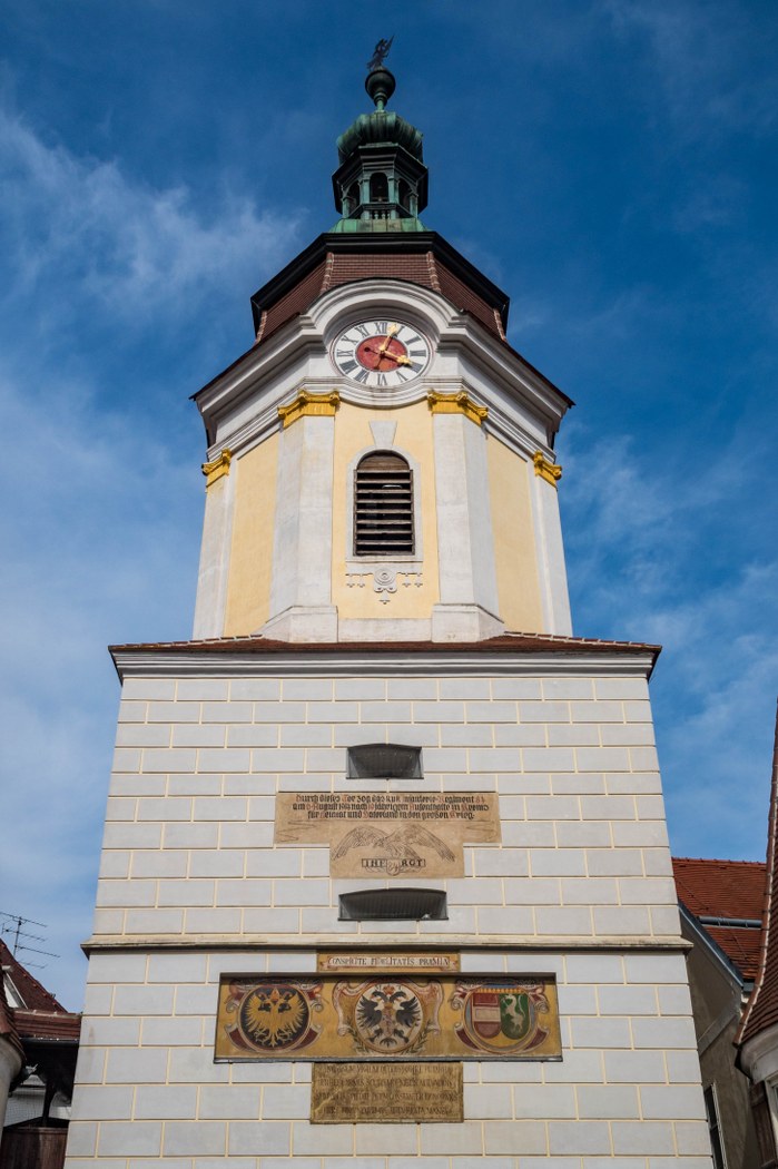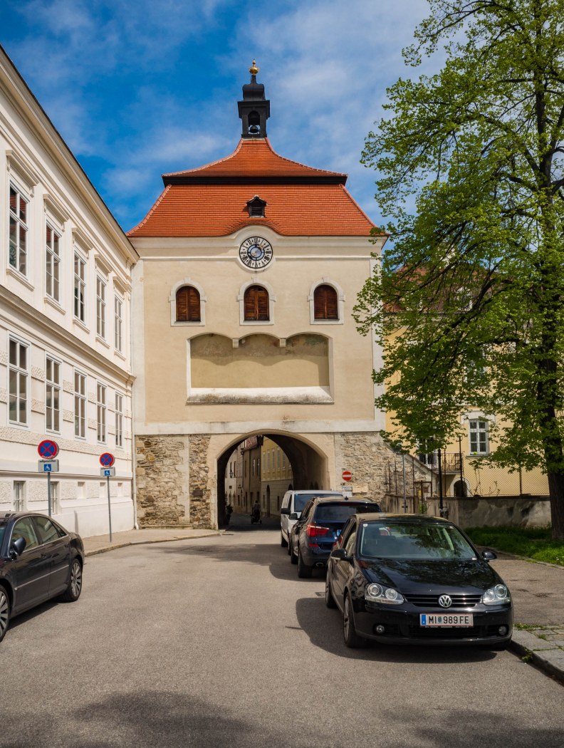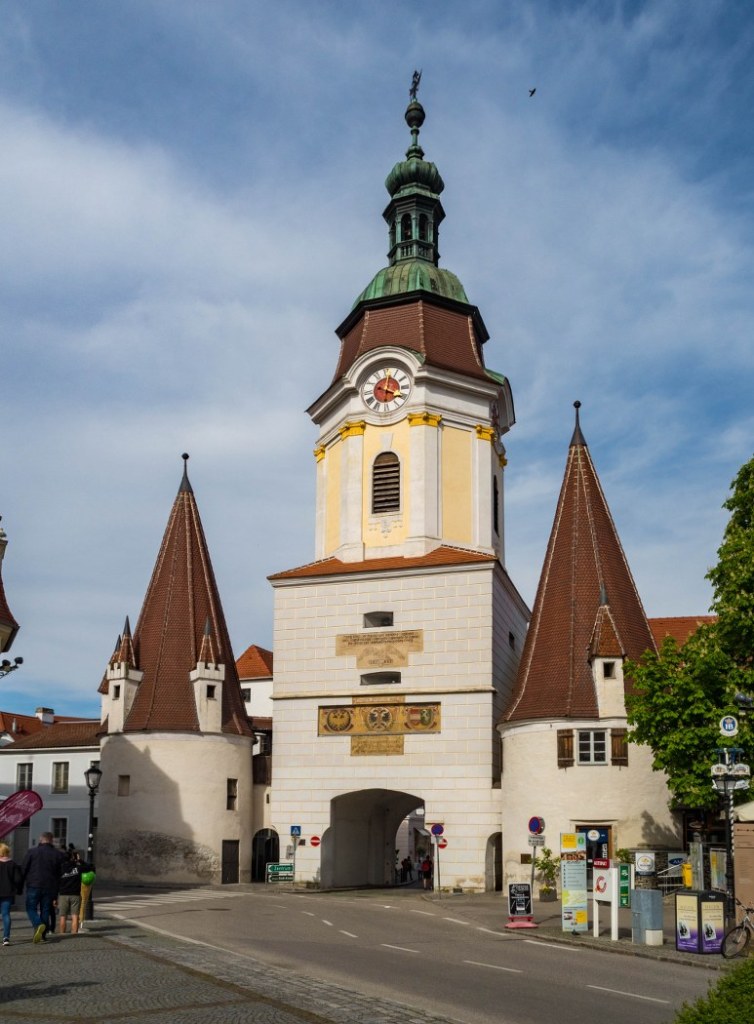 „Międzymieście” kończy się po kilometrze na Südtiroler platz, w cieniu jedynej ocalałej bramy miejskiej Krems. Jeśli widzieliście kiedyś jakieś zdjęcie z tego miasta to wielce prawdopodobne, że przedstawiało ono właśnie tę bramę. Steiner Tor bez wątpienia jest najciekawszym elementem dawnych umocnień – w swych najstarszych cegłach pamięta jeszcze średniowiecze, lecz dziś najwięcej blasku zgarnia dla siebie elegancka, barokowa nadbudowa zlecona przez cesarzową Marię Teresę. Gdy uważniej przyjrzycie się znajdującym się na wieży elementom dostrzeżecie herb Habsburgów z jej czasów, a zaraz obok dwa herby miasta, stare (jeszcze ze styryjską panterą) oraz obecne z dwugłowym orłem na czarnym tle. Świetna to lekcja heraldyki.