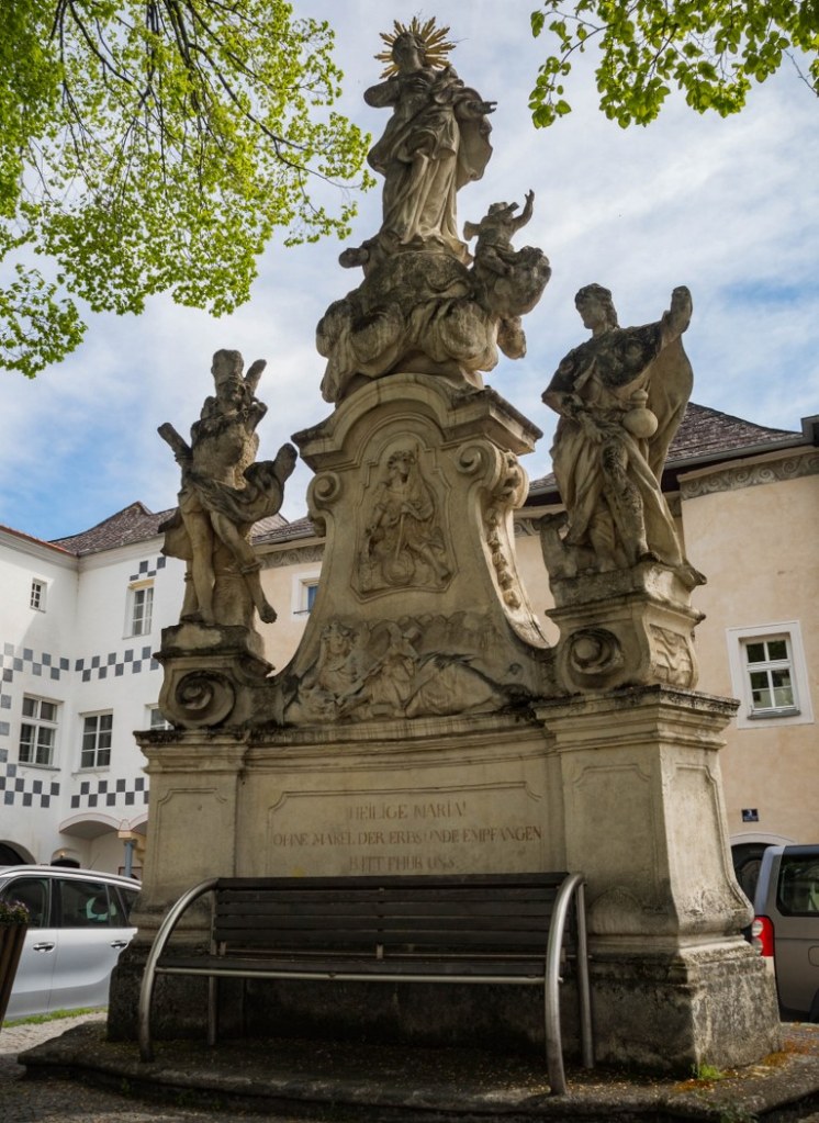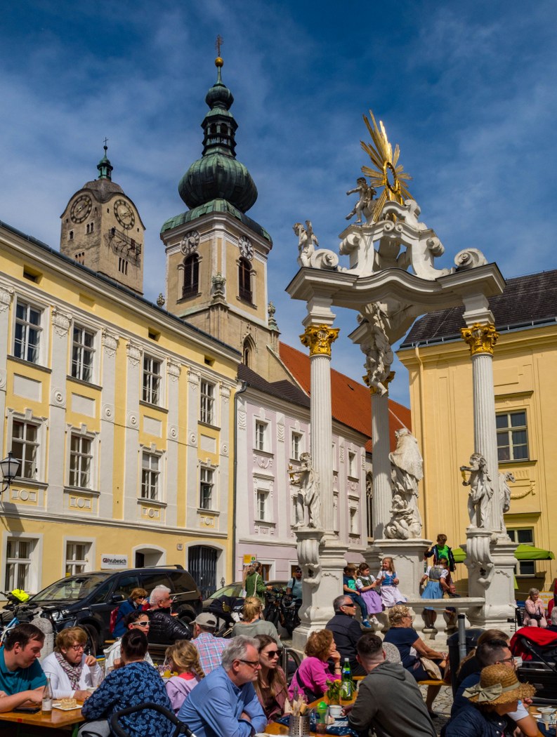 Napotykane place mają tendencję do wykładniczego powiększania swojej powierzchni. Pierwszy jest niewielki placyk z barokową kolumną Maryjną, która w tym wypadku jest i kolumną morową – tak w każdym razie wywnioskować można po towarzyszących Maryi świętych, Rochu, Sebastianie i Rozalii. Na następnym, placu Schurera renesans spotyka się z barokiem i jedynie jego funkcja jako parkingu może zepsuć jego odbiór. No i w końcu plac ratuszowy, który jak łatwo się domyśleć jest największym i najważniejszym. Tam też kryła się większość mieszkańców Stein – pod Drzewkiem Majowym biesiadowano delektując się miejscowym przysmakami.
