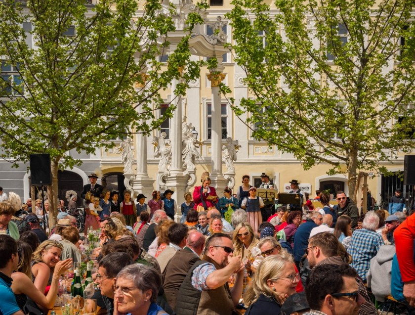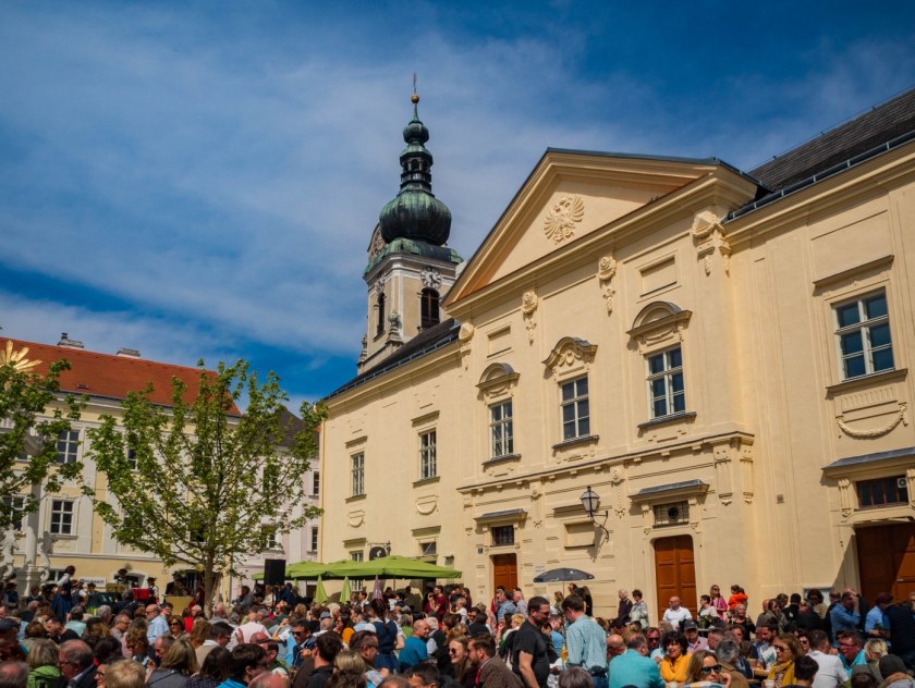 Wizyta wiosną to idealny czas na podziwianie zakwitających drzewek w sadach, winorośla wszakże wciąż leniwie przygotowują się do późniejszego rozkwitu. Co innego okoliczni winiarze, którzy nieustannie prężą mięśnie chwaląc się owocami poprzednich zbiorów – 1 maja, podczas festiwali stawiania Drzewka Majowego w ważniejszych miastach doliny można spróbować świeżutkich Grüner Veltlinerów, Rieslingów czy najbardziej miejscowych Neuburgerów. Tak przywitało nas Mautern, nie inaczej było w Krems und Stein. W pierwszomajowych festiwalach udział biorą całe miasteczka, dlatego warto zatrzymać się nie tylko na małe co nieco, ale i celem podpatrzenia jak bawią się miejscowi. Co ważniejsze jednak dzięki takim imprezom reszta miasta staje się niemalże pusta – i później, kiedy wszyscy dalej świętują można z pełnym brzuszkiem pohasać po ulicach i nie martwić się wchodzącymi w kadr przechodniami 😀