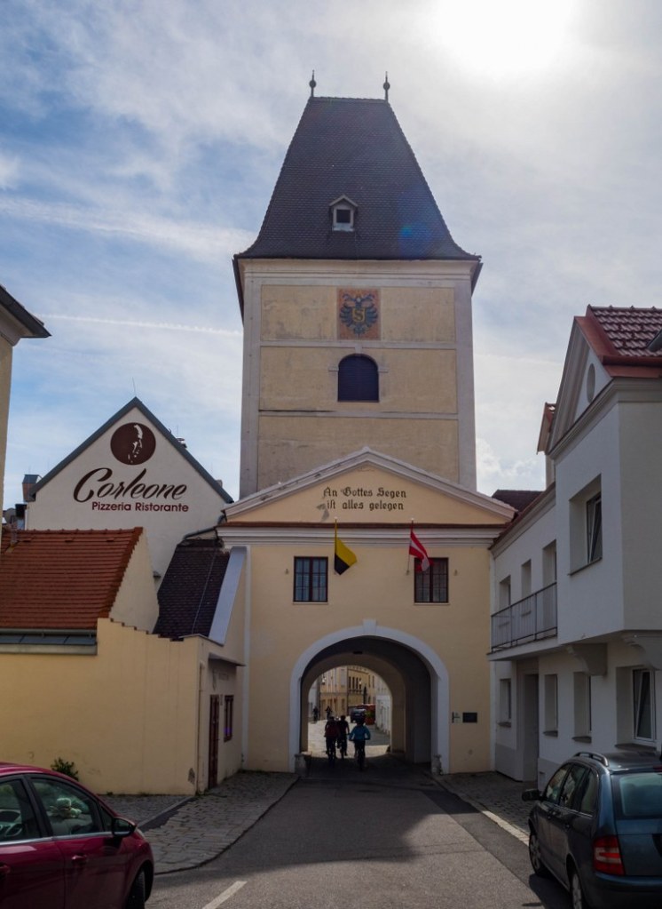 Krems i Stein już od średniowiecza funkcjonowały jako dość osobliwe dwumiasto – niby oddzielne, ograniczone osobnymi murami miejskimi a jednak połączone administracyjnie, pod jednym herbem i burmistrzem. Dziś dosłownie stanowią już jedno miasto, ale ślady po oddzielnych obwarowaniach pozostały – może i nie ma ich za wiele, ale dość łatwo pomagają zorientować się gdzie kończyło się jedno a zaczynało drugie. Zachodnim krańcem Stein było Linzer Tor, brama rzecz jasna wskazująca drogę do Liznu. Czy nazwanie jej „szczerbatą bramą” nie jest czasami trochę nieadekwatne i trochu obraźliwe? Bo nic nie poradzę na to, że często zdarza mi się częściowo „antropomorfizować” budynki i takie też skojarzenie mam kiedy patrzę na XV-wieczny budynek.