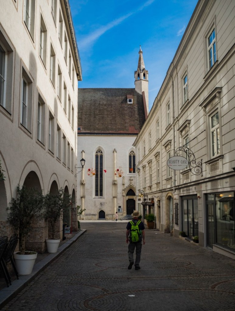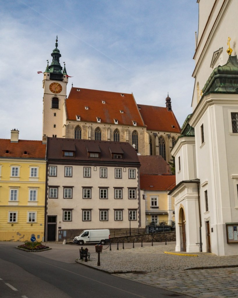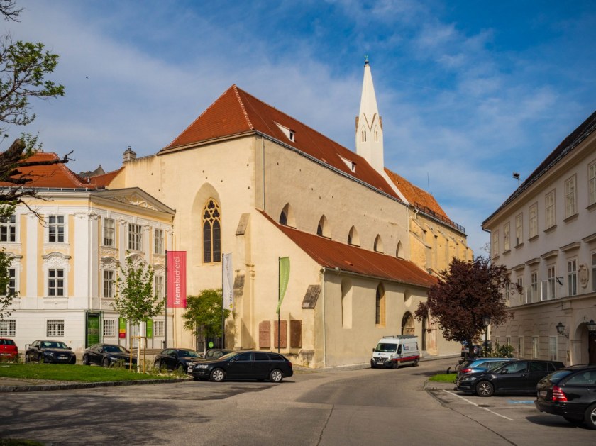 Kontynuując spacer główną uliczką miasteczka (zwaną omen nomen Steiner Landstrasse) traficie na jeszcze jeden ciekawy plac, przy którym zdecydowanie polecam wam się zatrzymać. I być zdecydowanie bardziej czujnym niż my byliśmy. Oto bowiem w bezpośrednim sąsiedztwie Placu Minorytów (zgadnijcie skąd taka nazwa? ;)) znajdziecie największą gotycką perełkę w całym dwumieście – kaplicę Göttweigerhof. Którą w spektakularny sposób ominęliśmy! I tego, że nie zobaczyliśmy tamtejszych XIV -wiecznych fresków, jednych z najwspanialszych w całej Austrii żałuję do dziś. Nie żałujcie wy i zaglądnijcie.