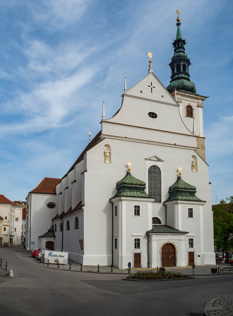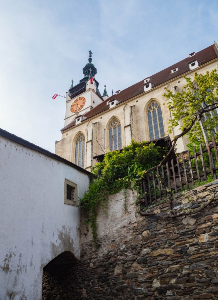 Czy mówienie o 1000 letniej historii jest przesadą? Trochę tak, bo też świątynia tylko w reliktach i pojedynczych cegłach pamięta tak dawne czasy. Bryła, którą dziś możemy podziwiać w dużej mierze powstała w XV wieku i już wówczas przylgnęła doń łatka „młodszej siostry katedry wiedeńskiej”. Stołeczną katedrą z kościołem w Krems łączy zresztą pierwotny patron, Św. Szczepan. Świątynia przeszła pełen cykl od bycia katolicką, protestancką, na powrót „skontrowaną” przez Jezuitów tak by dziś służyć za miejsce nabożeństw zakonowi Pijarów.