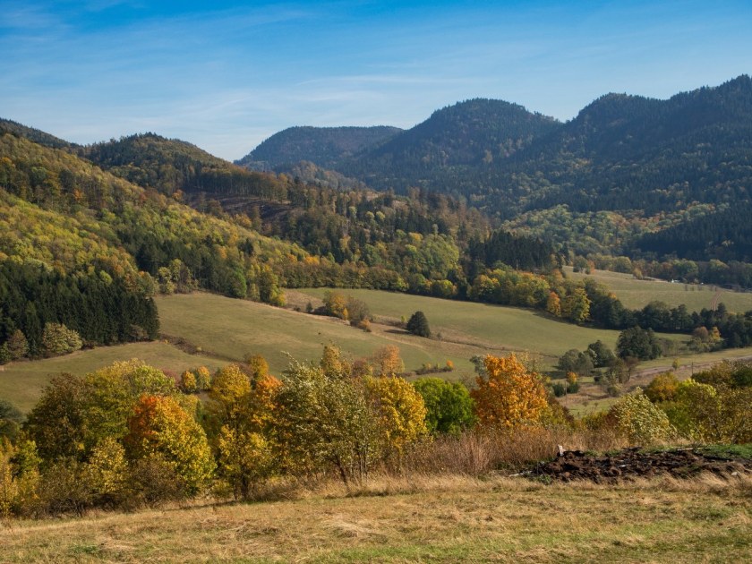Wolno płynąca Czyżynka w nieodległym lesie zaczyna robić wywijasy, pagóry przypominają sobie o urozmaiceniu rzeźby terenu, drzewa pięknie mienią się jesienną feerią barw. Takimi lasami można chodzić godzinami. Krótki to fragment, ale totalnie zjawiskowy – na jego końcu traficie na polanę z wiatą, gdzie przed „atakiem zamkowym” można usiąść na chwilkę i zregenerować siły. Dziś to jedyny przebłysk turystycznej infrastruktury w okolicy a jeszcze sto lat temu – niedaleko na północ znajdowała się gospoda Zeisgrundbaude, gdzie można było zjeść, napić się (w tym wydobywanej niedaleko wody mineralnej Adelsbacher Sprudel) jak i przespać. Zmotoryzowanym warto podpowiedzieć, że od strony Cisowa można podjechać autem i dość blisko polany (przy końcu drogi asfaltowej) zostawić samochód na prowizorycznym parkingu, tak więc jeśli nie macie zbytnio czasu na wędrówkę po Parku to warto skorzystać z tej opcji.