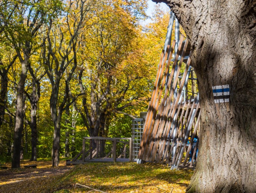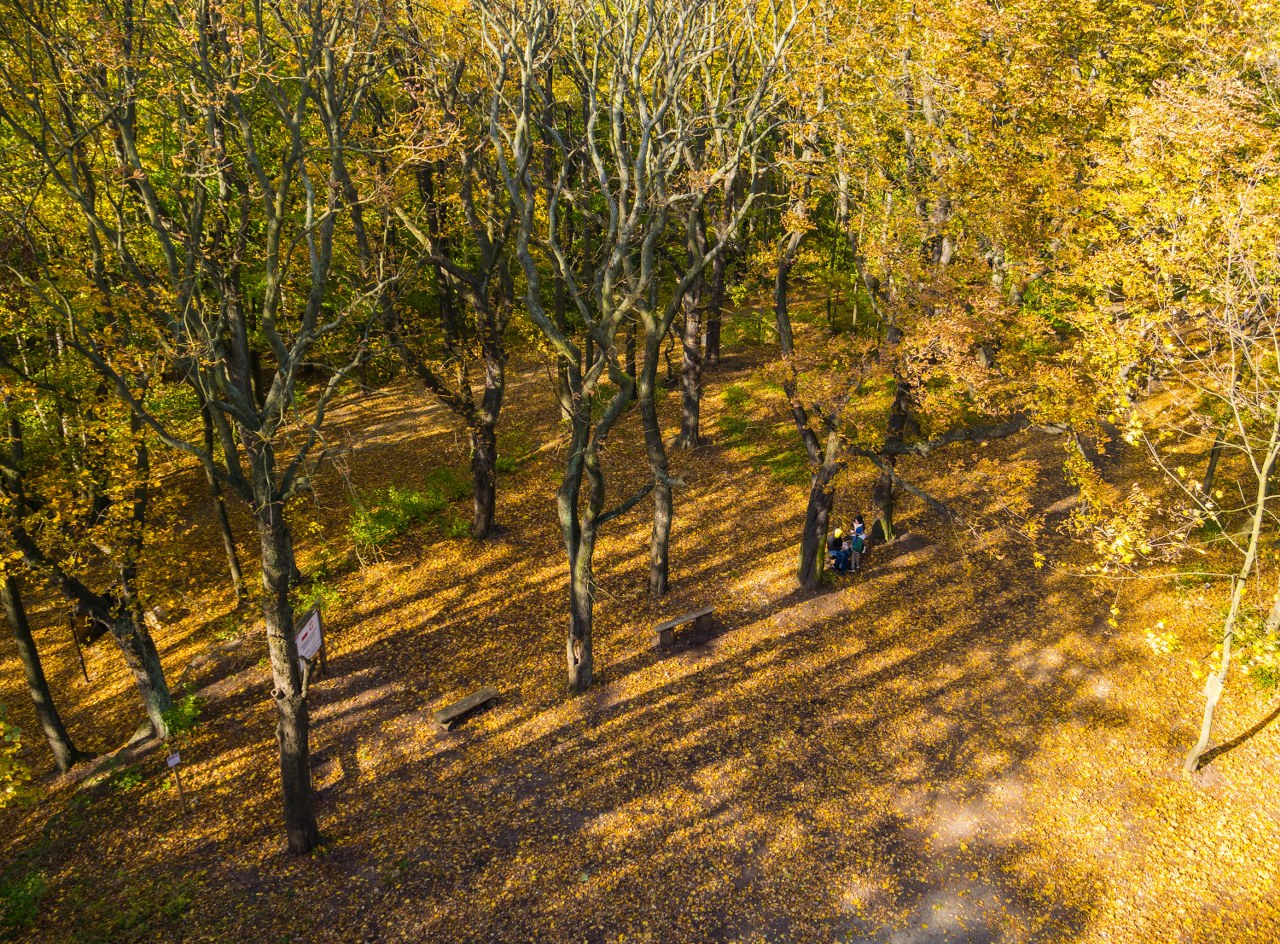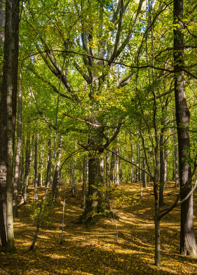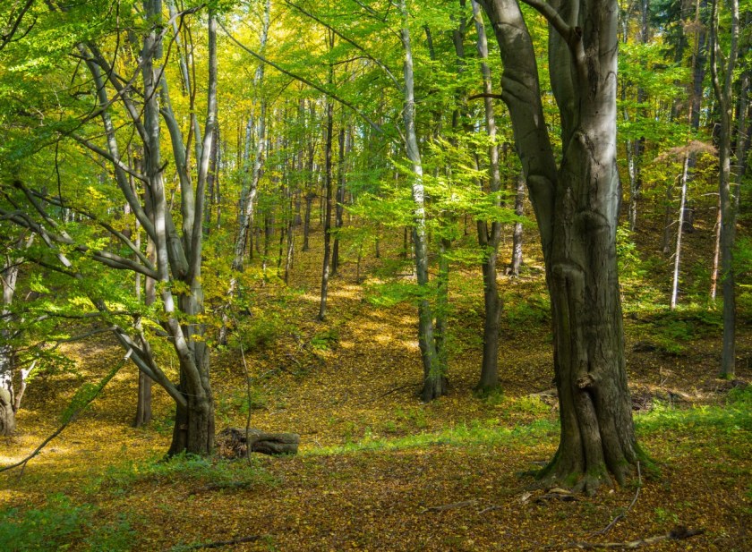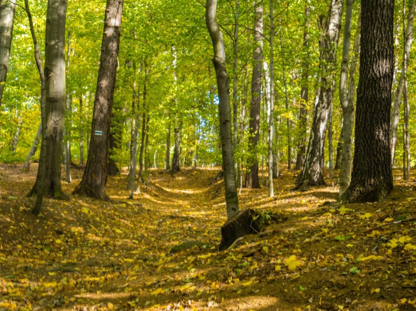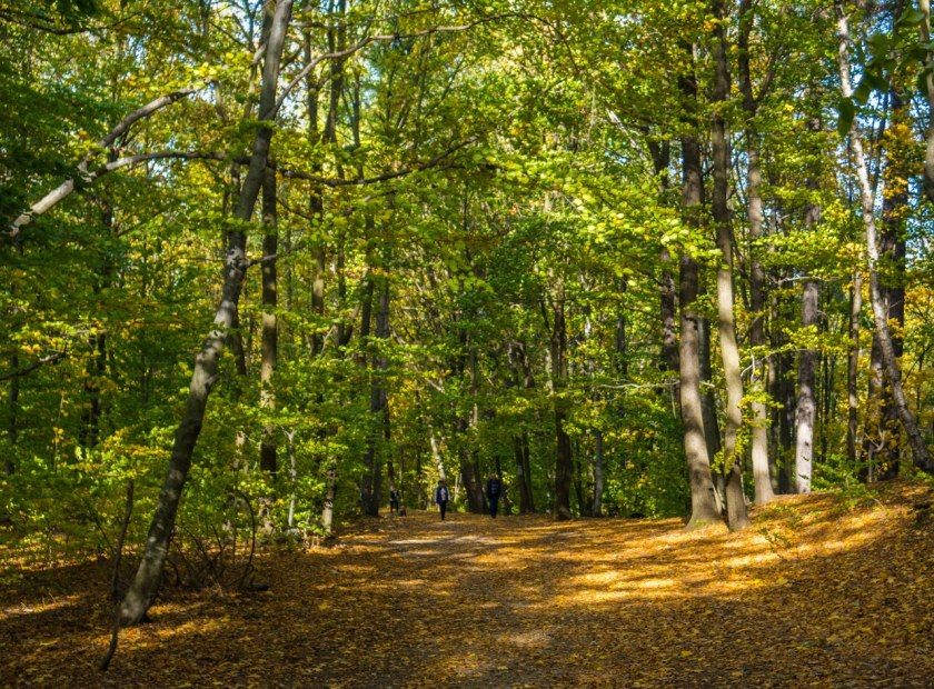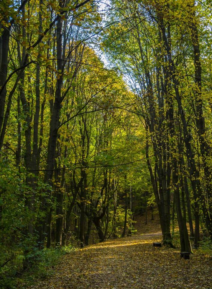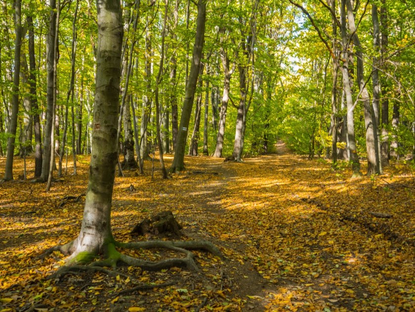 No dobra, ale co z tym wzgórzem i tą wieżą. Otóż na Placu Gedymina (czyli dokładnie na zdjęciu powyżej) niebieski szlak robi woltę i skręca, po chwili zostawia budynki za sobą i zaczyna się krótkie, naprawdę krótkie raptem 10 minutowe podejście lasem. Jest krótko, łatwo i bardzo ładnie. Bukowy las jesienią prezentuje się obłędnie.