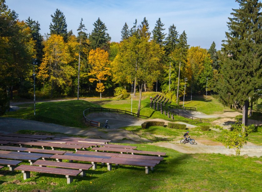 Kawałek dalej tuż przy szlaku robi się jeszcze ciekawiej. Od przeszło 20 lat ten bardziej stromy i urozmaicony kawałek wzgórza służy za tor dla kolarskiego four crossu, konkurencji diablo widowiskowej. Wywijasowy tor o długość niemal 500 metrów, z szeregiem band i sekcji rytmicznych nie raz, nie dwa był miejscem walki o Mistrzostwo Polski a na co dzień służy miejscowym dzieciakom, lubującym się w jeździe z nutą adrenaliny.