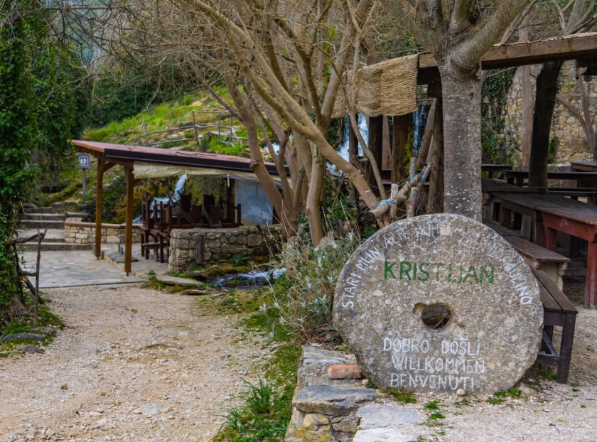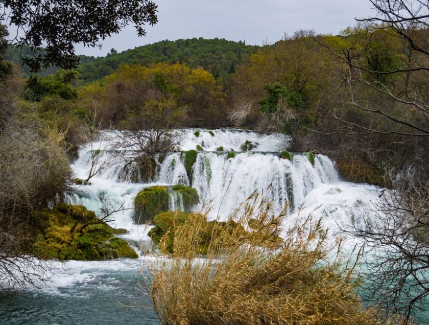Jest tu co robić. W pierwszej kolejności warto spotkać się z wysokim na 22,5 metra wodospadem. Krka szeroka jest tu na przeszło 150 metrów i bardziej przypomina kolejne jezioro niźli rzekę. Robimy krótki spacer w stronę kolejnych starych młynów, w lutym zamkniętych, latem służących choćby za restaurację. To w ich cieniu znajduje się mostek do którego przybijają kursujące po rzece statki i tenże mostek jest najlepszym (poza opcją podpłynięcia) punktem widokowym na Roški Slap. Wodospad robi wrażenie, ale to pagór na drugim planie zgarnia laur najbardziej imponującego gracza w okolicy.