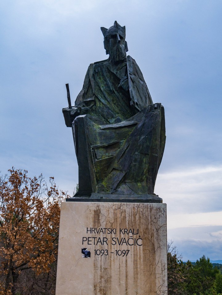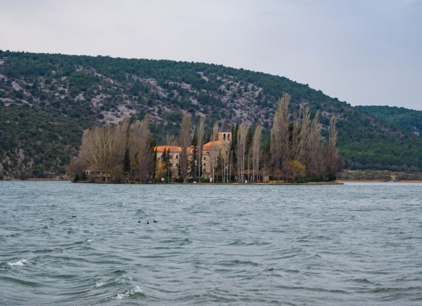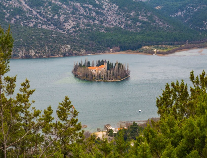 Visovac to wyspa położona na jeziorze o tej samej nazwie, jezioro z kolei jest integralną częścią rzeki Krka. Już od średniowiecza niewielka wysepka jest siedzibą Franciszkanów, którzy to w połowie XV wieku wznieśli nań klasztor. W sezonie (od kwietnia do października) na wyspę kursują łodzie a świątynię jak i otaczająca ją przyrodę można zwiedzać. W lutym trzeba jednak obejść się smakiem i wespół z niewzruszonym pomnikiem ostatniego chorwackiego króla sprzed unii z Węgrami, Petarem Svacicem pozostało nam spojrzeć na wyspę z platformy widokowej. Szeroka Krka przechodząca w jezioro Visovac prezentuje się tu majestatycznie.