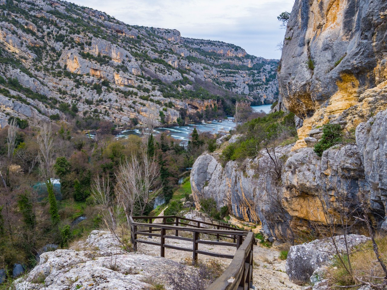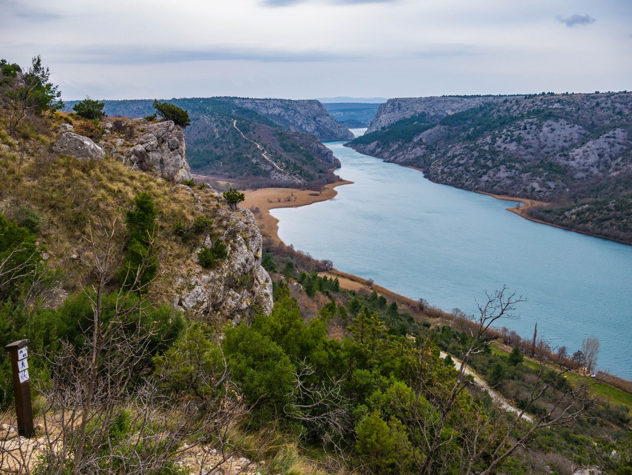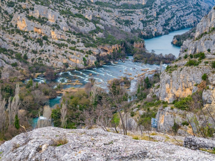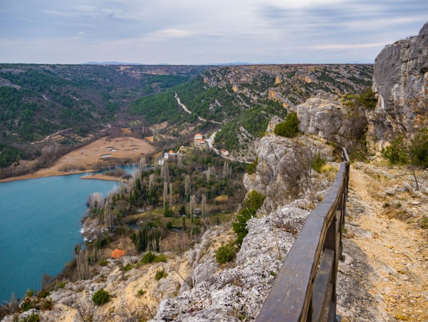 To jednak dopiero przystawka. Okoliczne pagóry oferują kapitalne widoki i Marass nie byłby sobą jakby nie postanowił się nie wspiąć. Spacer jest krótki, ale intensywny. Długi na niecały kilometr (w czasie którego z 44 mnpm przy rzece robi się 207 na punkcie widokowym) prowadzi skałami, przez długi czas zabezpieczonymi drewnianymi barierkami. Momentami jest stromo, ręce idą w ruch i przyznam wam, że w lutym, ale takim bardziej śnieżnym/mroźnym bez raczków nawet bym nie pomyślał by się tu zapuszczać. Anyway, widoki po drodze rekompensują każdy wysiłek a Krka, okoliczne pagóry i trawertynowe progi Ogrlice robią piorunujące wrażenie.