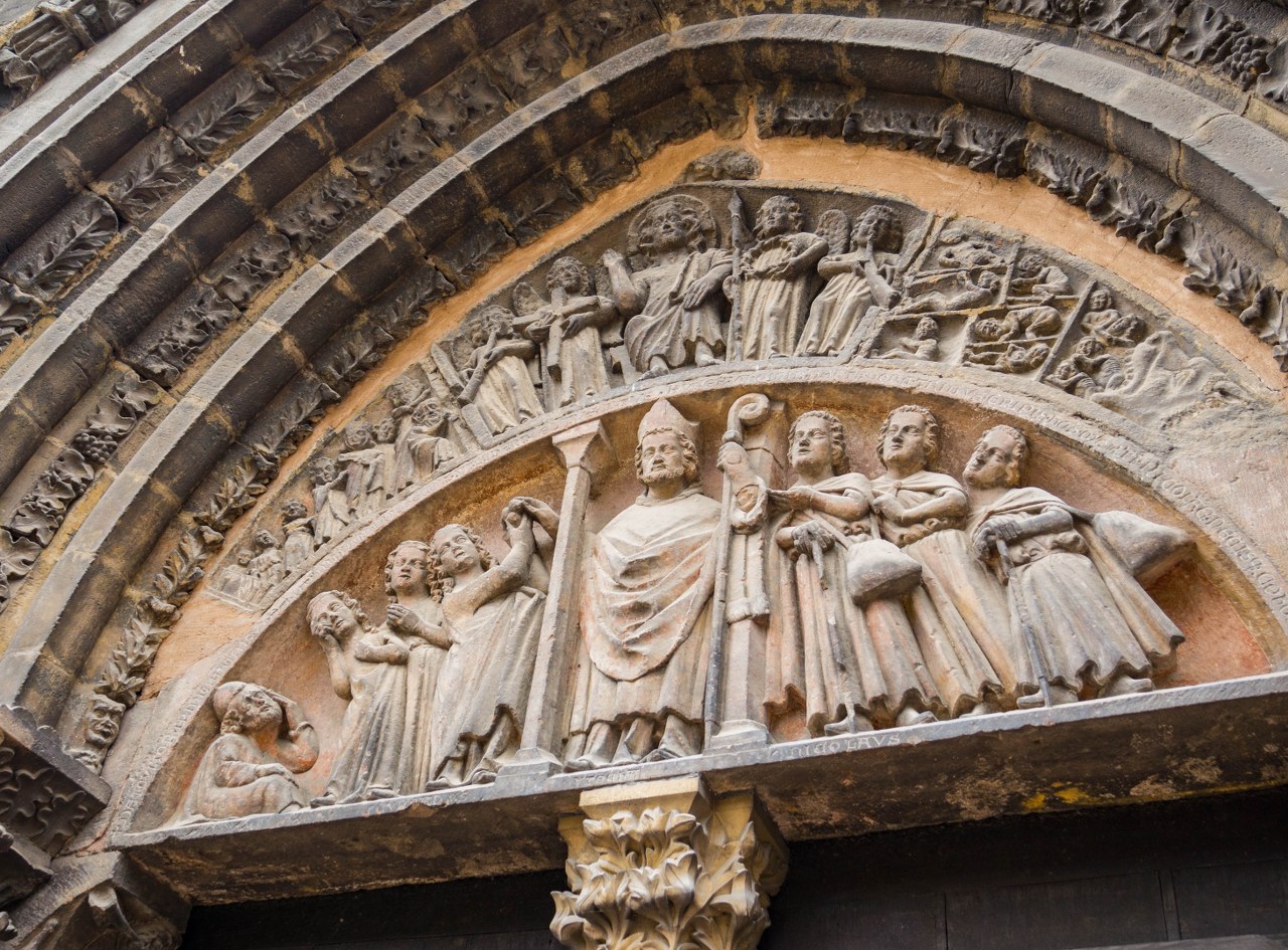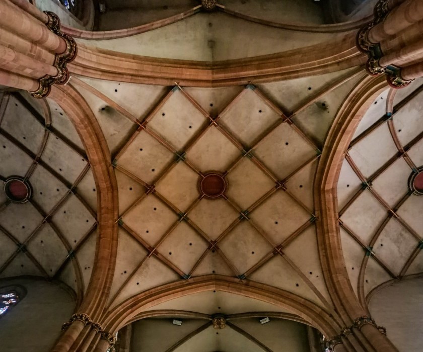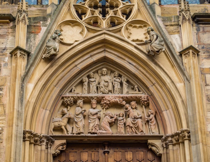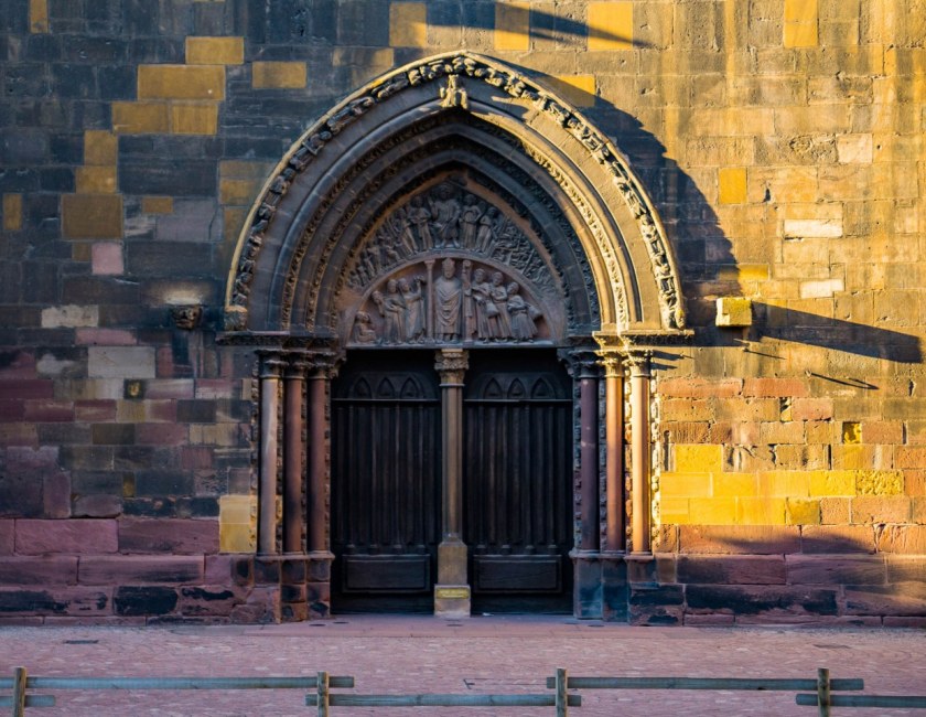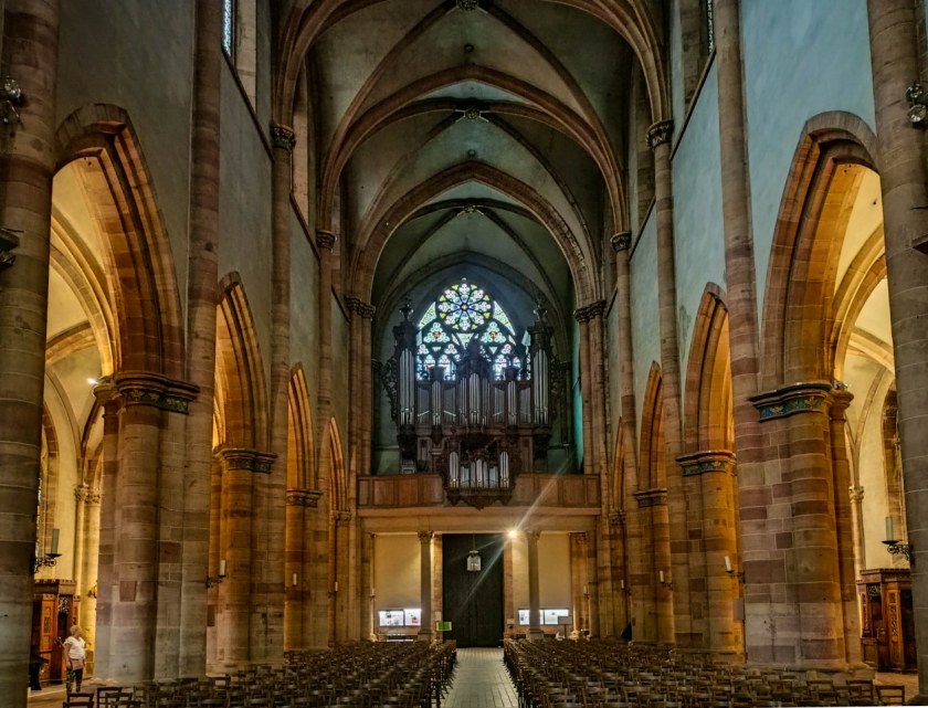 Pewne jest to co widzą nasze oczy, a tym ukazuje się potężna sylwetka świątyni, w Alzacji ustępująca tylko katedrze w Strasbourgu. To jeden z tych projektów, których ukończenie zajęło zdecydowanie więcej lat niż było przewidziane – początek prac przypada na rok 1234, oficjalny koniec na 1356 a… dodatkowe prace przy choćby sklepieniu krzyżowym trwały do roku 1491. Nie wspominając o pożarze z roku 1572 i renesansowej przebudowie szczytu wieży. Uwagę na siebie zwracają portale świątyni, niewielkie (po tym co zobaczyłem w Thann prawie każde mogą się takie wydawać), ale dopracowane w każdym szczególe, z misternymi tympanonami.