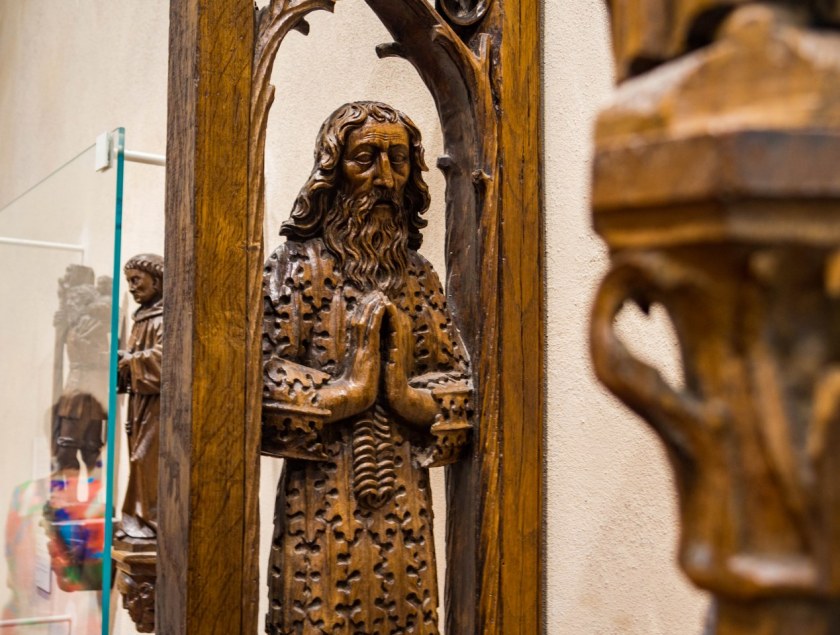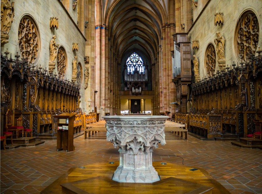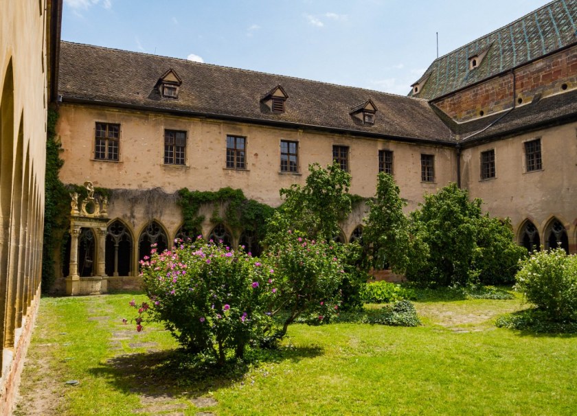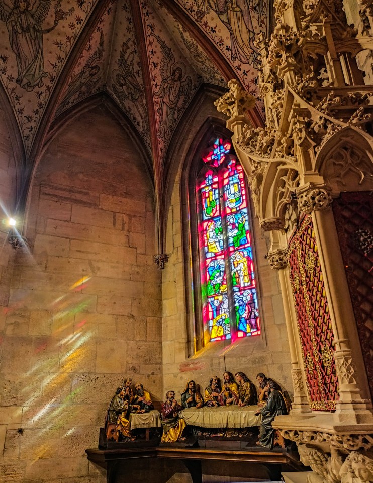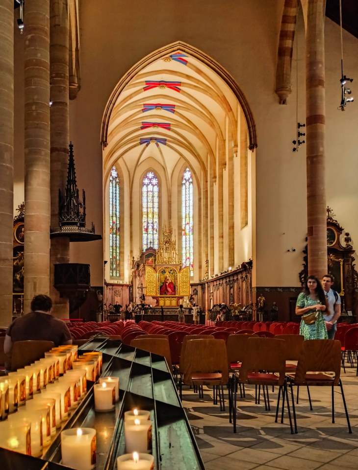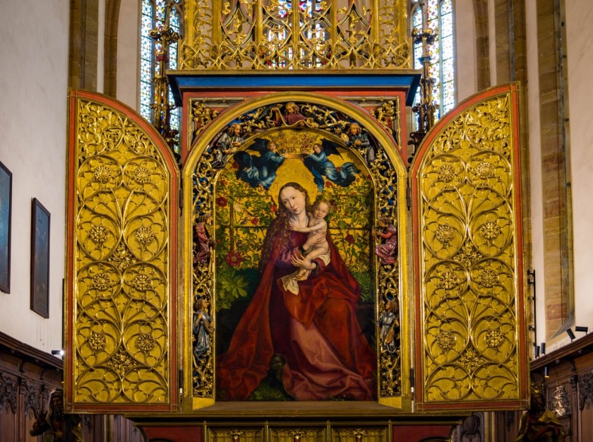 Jeśli miałbym wam polecić jeszcze jakiś kościół do odwiedzenia to będzie to gotycki kościół Dominikanów. Powód jest jeden: Madonna wśród róż, obraz Martina Schongauera, jedno z ważniejszych dzieł tego urodzonego w Colmar (najpewniej) artysty. Wydaje mi się, że sam namalowany na drewnie obraz nie zrobiłby na mnie takiego wrażenia gdyby nie osadzenie go w neogotyckiej ramie i ołtarzu, takim bogato zdobionym pseudo tryptyku – pięknie się wszystko tu komponuje. Wnętrza świątyni, w odróżnieniu do kolegiaty doczekały się częściowej barokizacji, najmocniej zauważalnej w chórze za obrazem Madonny – zwróćcie uwagę na drewniane barokowe stalle i ołtarz.