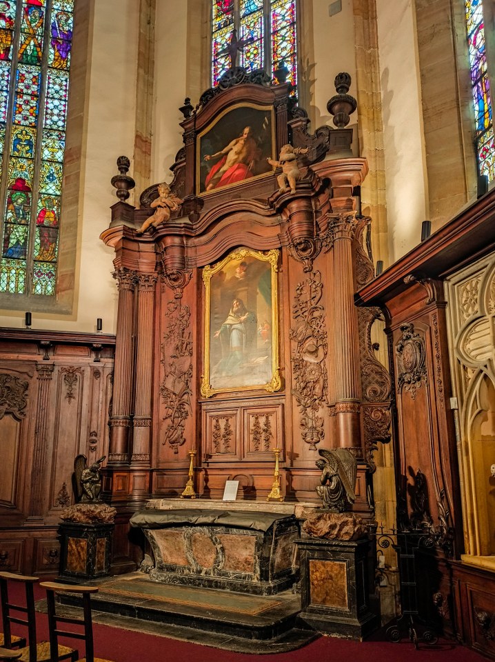 Częściowo zdewastowane podczas Rewolucji Francuskiej wnętrze zdaje się do dziś pozostawać skromniejszym niźli przed wielkim ludowym zrywem. To co jednak ocalało (lub zostało sprowadzone z innych parafii) robi wrażenie – XVI-wieczne tryptyki, imponujące stalle przedstawiające głównie postaci ze Starego Testamentu, witraże, kamienna chrzcielnica czy w końcu XVIII-wieczne organy autorstwa nikogo innego jak rodziny Silbermannów, alzackich mistrzów w tej materii. Wszystko to skryte pod okazałymi i sklepieniami każdego niemal typu: od krzyżowego przez gwiaździste po sieciowe. Skromnie nie znaczy nudno.