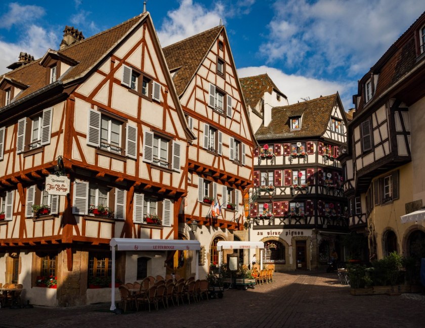 Colmar pełne jest zabytkowego blichtru, zjawiskowych, kolorowych domów z muru pruskiego, wymyślnych kamienic z każdej możliwej epoki, imponujących gotyckich świątyń, muzeów niezgorszych. Poprzecinane rzeką (i kanałami) Lauch nazywane jest Małą Wenecją i… choć określenie to może wydawać się być lekko na wyrost to niech już będzie, niewielkiemu fragmentowi miasta dzierżącemu to miano nie można odmówić urody. Dodajmy do tego dziesiątki knajpek oraz restauracji i otrzymujemy mieszankę iście kapitalną. Kapitalną na tyle, by przyciągać tłumy czasami nieznośne, potrafiące w ciągu dnia uprzykrzyć zwiedzanie. Dlatego mając tu do dyspozycji kilka dni korzystałem z każdego ranka i wieczora by uszczknąć z colmarskiego tortu jak najsmaczniejsze kąski.