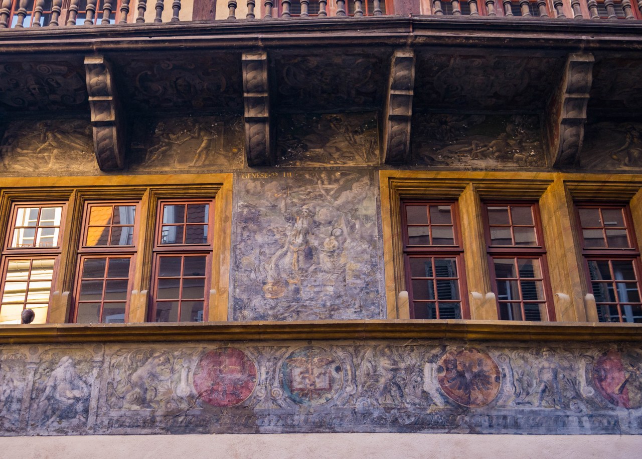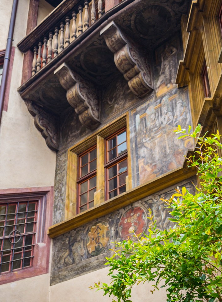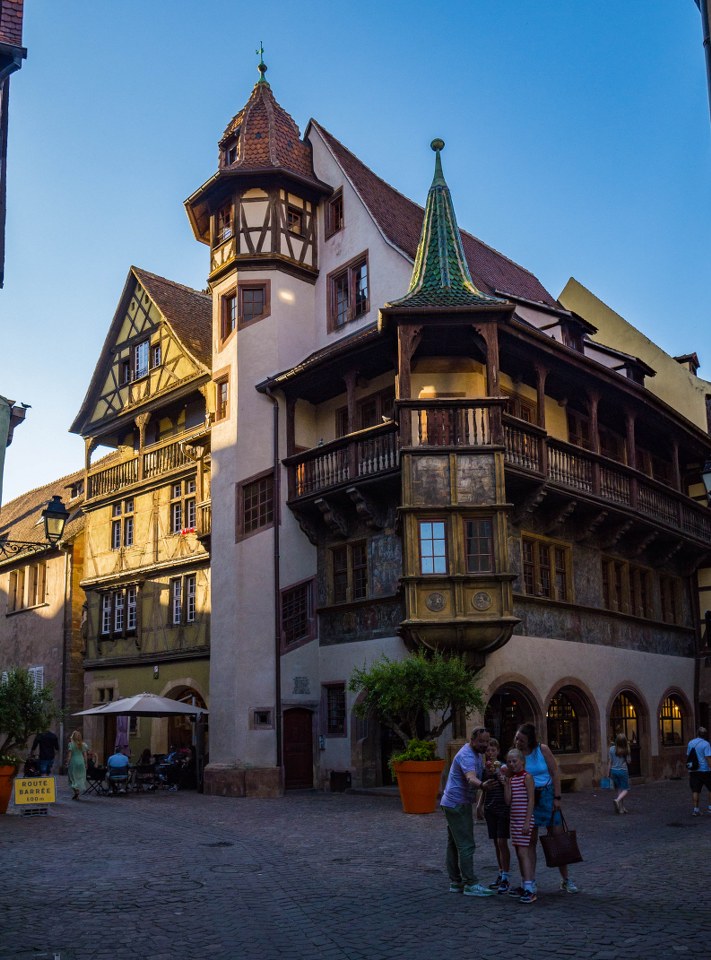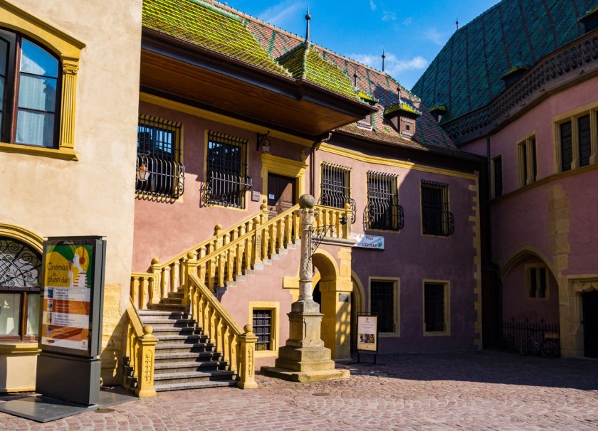 W każdym razie, pośród wszystkich pięknych budynków w Colmarze jeden wyróżnia się na tyle, że z zamkniętymi oczami wskażecie go na mapie miasta (no dobra, z tą mapą to przesada, ale jego sylwetkę zapamiętacie na pewno). Maison Pfister, imponujący renesansowy dom z charakterystyczną wieżą, jeszcze bardziej charakterystycznym wykuszem, drewnianą galeryjką i interesującymi ściennymi malowidłami przedstawiającymi scenki tak biblijne jak i historyczne. Może i nie odegrał w filmie kluczowej roli, ale jego sylwetka na tyle wyróżnia się z tłumu, że raz dwa, na stałe ląduje w podświadomości.