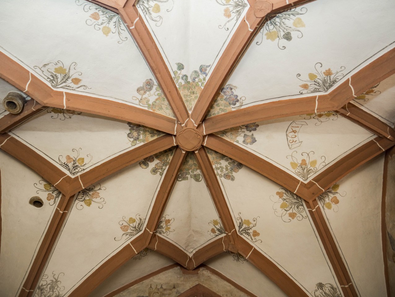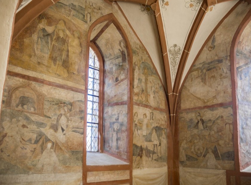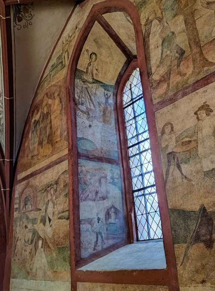Kościół w obecnej formie pochodzi z XV-wieku i prezentuje się nadzwyczaj dobrze a jego wnętrza to dla wielbicieli architektury gotyckiej nie lada gratka. Pięknie prezentują się krzyżowe sklepienia chóru – ozdobione odrestaurowanymi, roślinnymi motywami – oraz późnogotyckie witraże przedstawiające m.in. patronkę świątyni. To co jednak robi największe wrażenie znajduje się na ścianach parteru wieży – XV-wieczne freski przedstawiające postać Św. Mikołaja, jego żywot i legendy z nim związane, ot choćby tę o Żeglarzach na morzu. Malowidła odkryto dopiero 1879 roku, na szczęście konserwatorzy zadbali o to by zostały one z nami na wiele kolejnych dziesięcioleci.