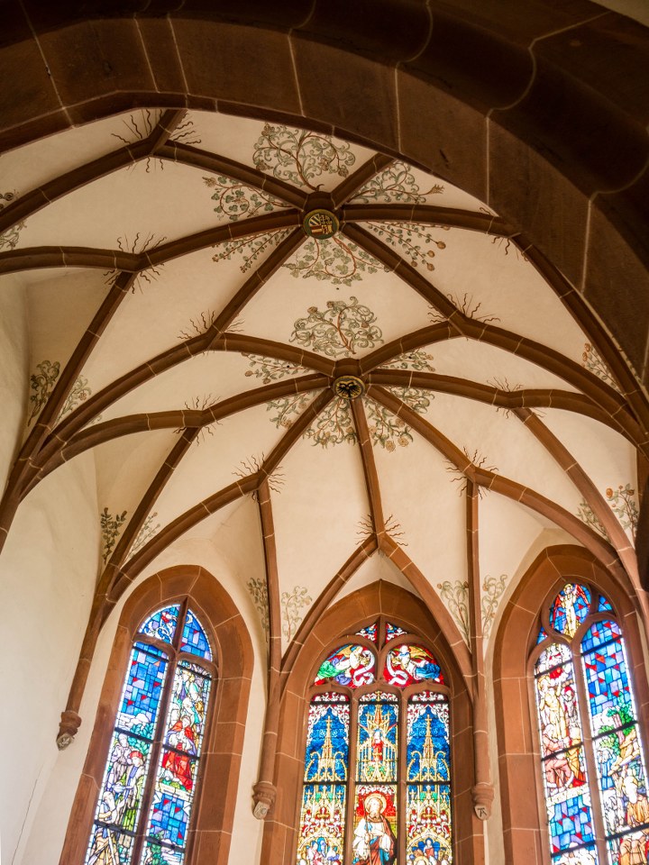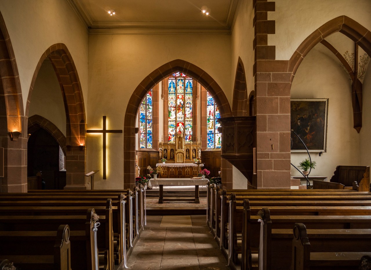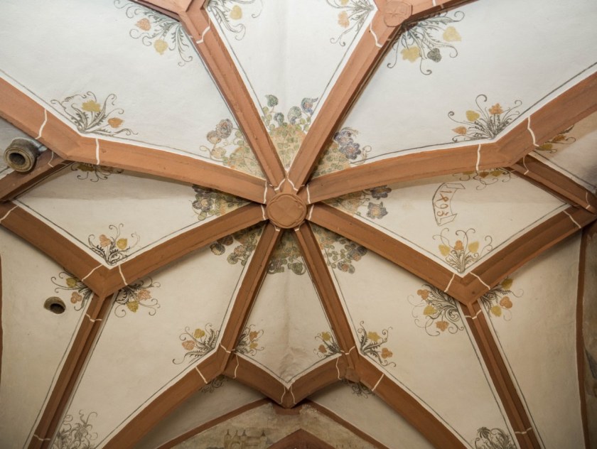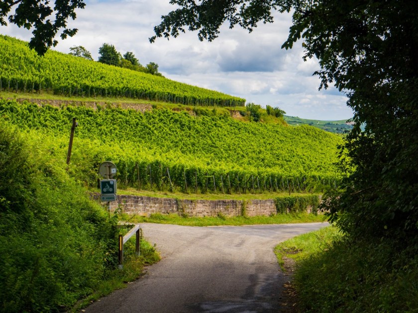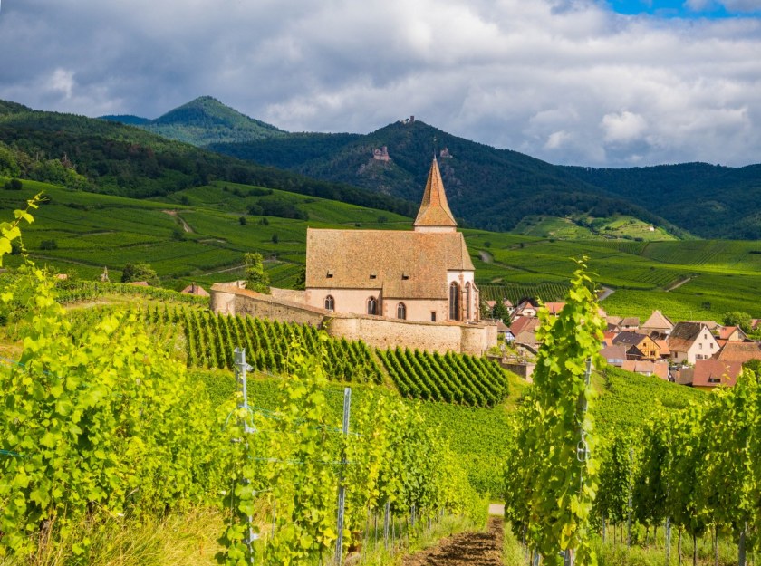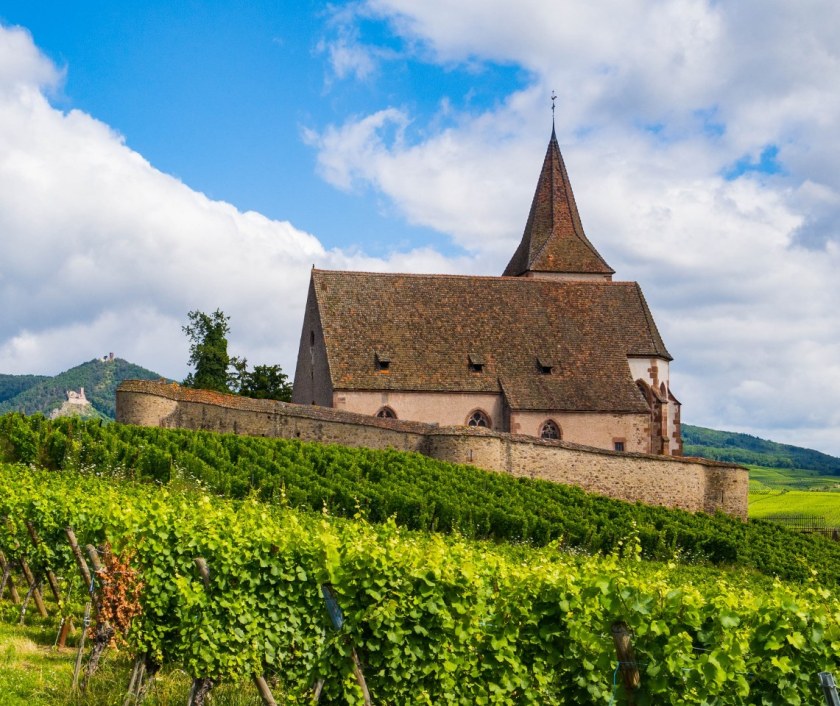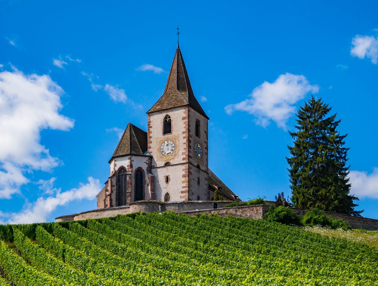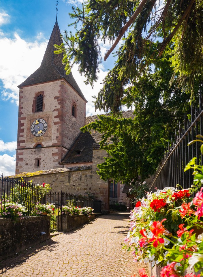 Gotycki kościół Św. Jakuba Apostoła tak jak i jego poprzedników wybudowano na górującym nad wsią wzgórzu. Nie wiem czy od zawsze stoki pagórka pełne były winorośli, ale dziś jednak nikt innego widoku już sobie nie wyobraża. Sama świątynia jest jak na Alzację dość wyjątkowa bo otoczona niewielkim murem (choć wysokim na przeszło 3 metry) obronnym z równie niewielkimi bastionami. Czy spełniły one swoje funkcje tego nie wiem, okazji z pewnością nie brakowało – pewnym jest, że nie otoczona murem wieś dość mocno ucierpiała choćby podczas Wojny Trzydziestoletniej.