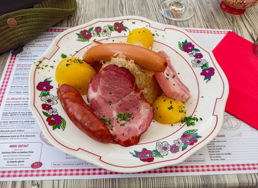 Jeśli w godzinach popołudniowych złapie was w Ribeauville głód to pamiętajcie, że tak od 14.00 do 18/19.00 spora część restauracji jest zamknięta (tak, mają tu swój rodzaj siesty) i te pozostałe-otwarte są przez te kilka godzin mocniej oblegane. Wieczorową porą, kiedy już wszystkie kulinarne przybytki otwierają swe podwoje jest zdecydowanie luźniej. Sam porę obiadową wykorzystałem na spotkanie z jednym z alzackich specjałów, Choucroute. Danie przez wielu nazywane alzackim bigosem, ale no kurde, bigos to bigos a to jest coś zupełnie innego. Sercem dania jest gotowana białym winie tylko kapusta kiszona (przyprawiana trochę innym zestawem przypraw) w obstawie kilku rodzajów mięsa, od parówek, przez boczek po golonkę – przy czym inaczej niż w bigosie mięsa czy kiełbasy są podawane w całości jako dodatki do kapusty. Wszystko podane z pyrkami i kapitalnym rieslingiem. No czyż może być lepiej? <Makłowicz mode>