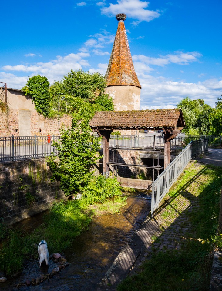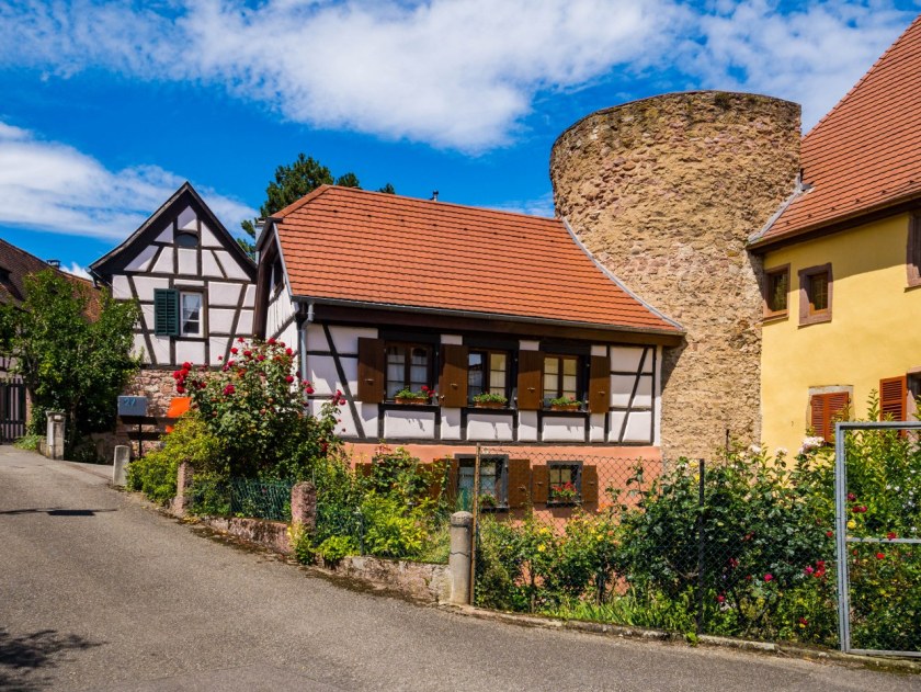 Ribeauville podobnie jak choćby Riquewihr już od średniowiecza otoczone było murami obronnymi. I to nie jednym „systemem” a tak jakby kilkoma osobnymi, odpowiadającymi za każdą z czterech ówczesnych dzielnic… które z kolei do końcas XIV-wieku stanowiły tak jakby osobne podmiasta podlegające różnym właścicielom. Sieci murów o łącznej długości długości kilku kilometrów, bramy łączące poszczególne dzielnice. W okresie ich największej świetności musiały wyglądać imponująco. Do naszych czasów nie dotrwało jednak wiele, większość fortyfikacji rozebrano w XIX-wieku. W poszukiwaniu tego co zostało najlepiej udać się na południowe krańce miasta, znajdziecie tam kawałek murów oraz m.in. dwie XV-wieczne Bocianie baszty, charakterystyczne zakończone niewielkimi platformami na bocianie gniazda.