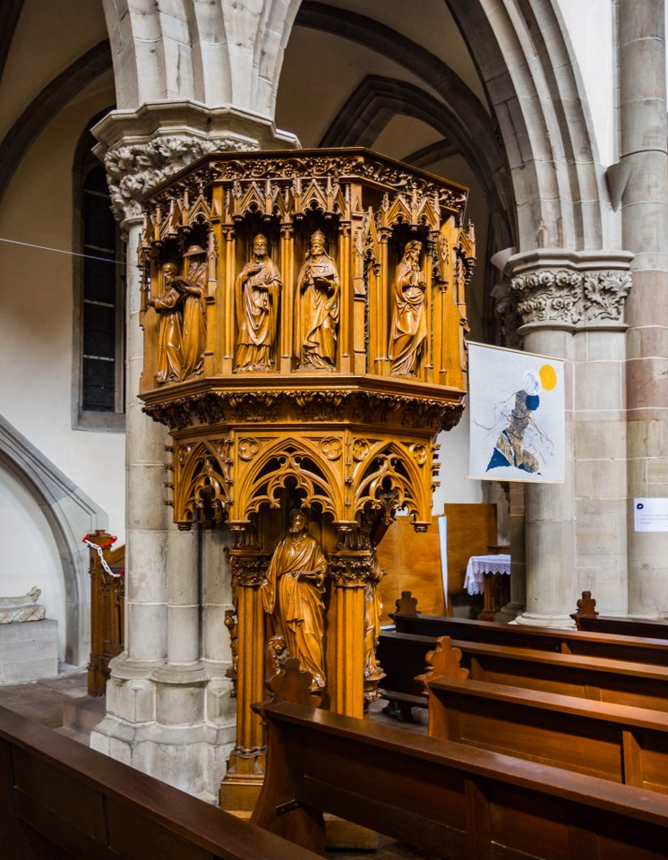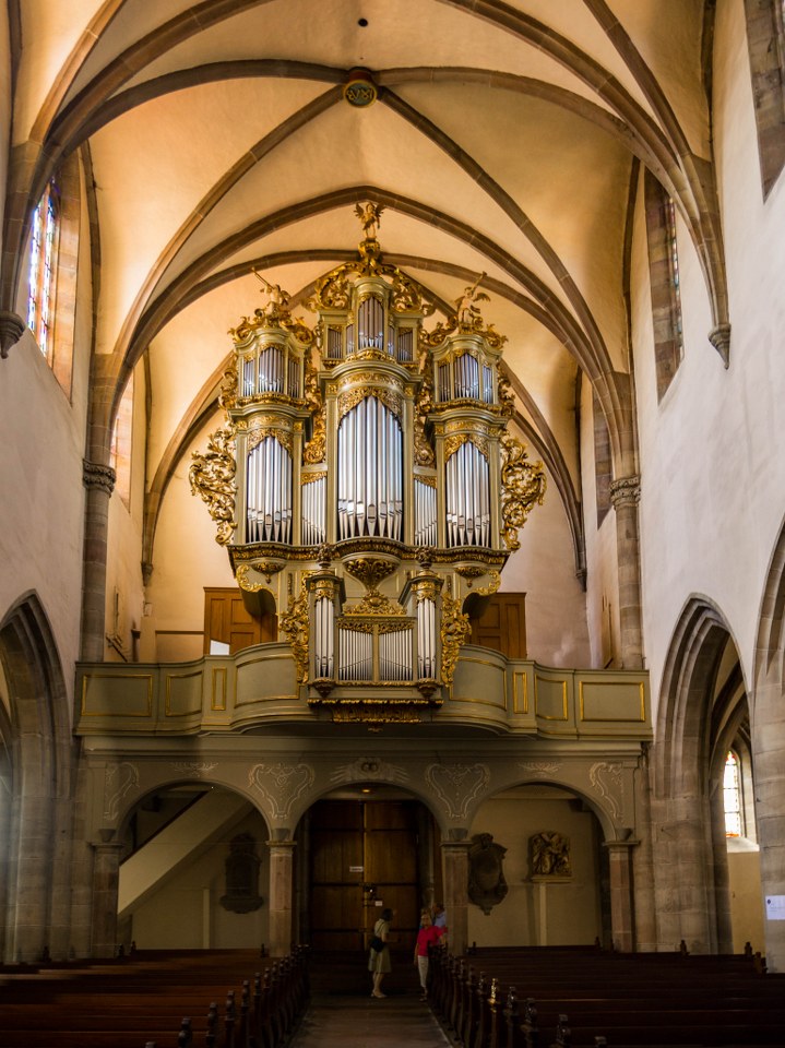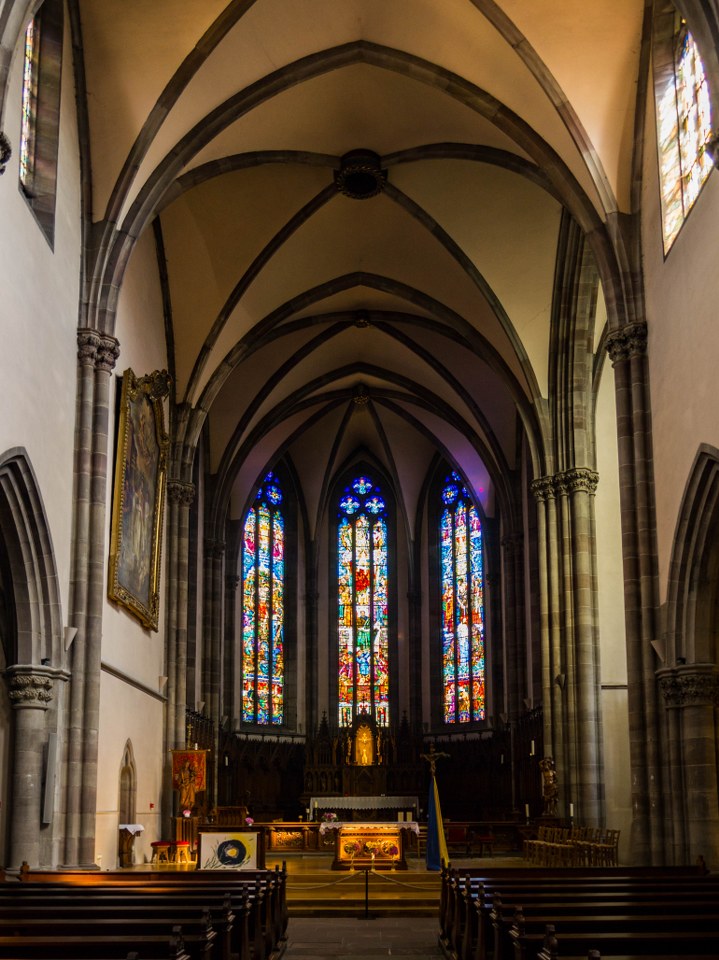 Dzisiejsze wnętrza są niesamowicie surowe i „ożywają” dopiero w okolicy prezbiterium oraz prospektu organowego. Skryty w cieniu chór z neogotyckimi stallami, ołtarzem i dość współczesnymi witrażami (najstarsze witraże usunięto w czasie Reformacji, kolejne zniszczono podczas II Wojny) kontrastuje z pławiącymi się w świetle organami. Potężny instrument również przeszedł wiele, pochodzący z kościoła Dominikanów ze Starsbourga w czasie I Wojny Światowej posłużył za źródło metalu dla wojska, przebudowany po wojnie nie musiał czekać kolejnych 15 lat by zostać poważnie uszkodzonym podczas kolejnego światowego konfliktu.