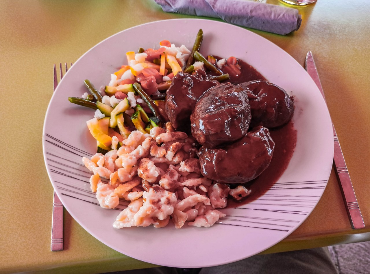 Na małe co nieco zatrzymałem się w Restaurant Brasserie La Mosaïque naprzeciw barokowego ratusza z 1767 roku. To zabawne jak bardzo w gotyku i renesansie zanurzone są miejscowe wsie i miasta i jak bardzo pojedyncze barokowe budynki wyróżniają się z tłumu. Z menu wybrałem alzackie klopsiki (fleischkiechle) podawane ze szpeclami i gotowanymi warzywami. Kolejny smaczny przystanek na alzackiej mapie kulinarnej odhaczony.