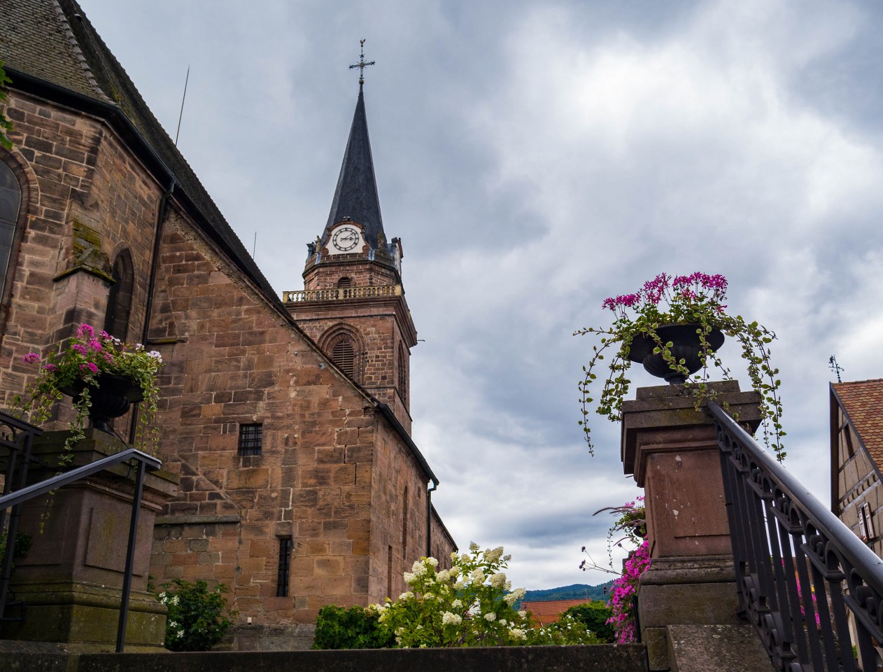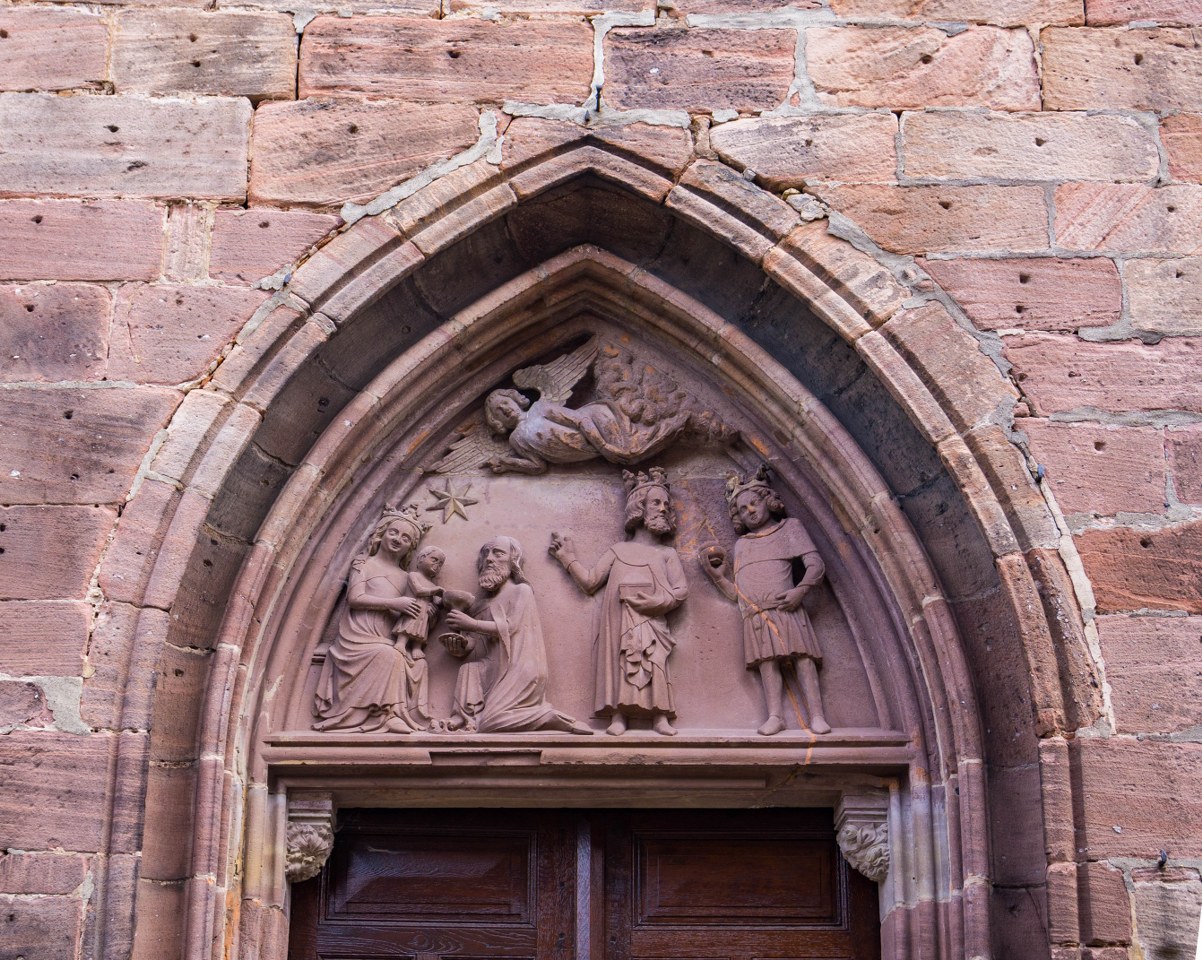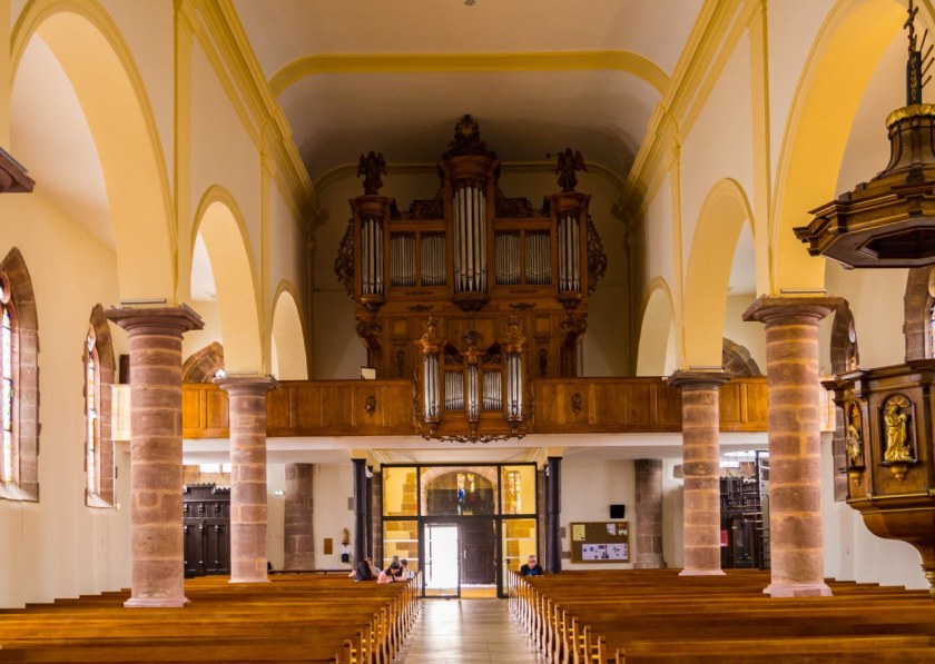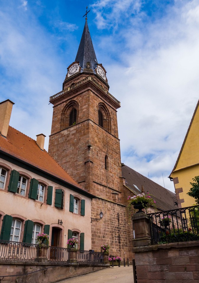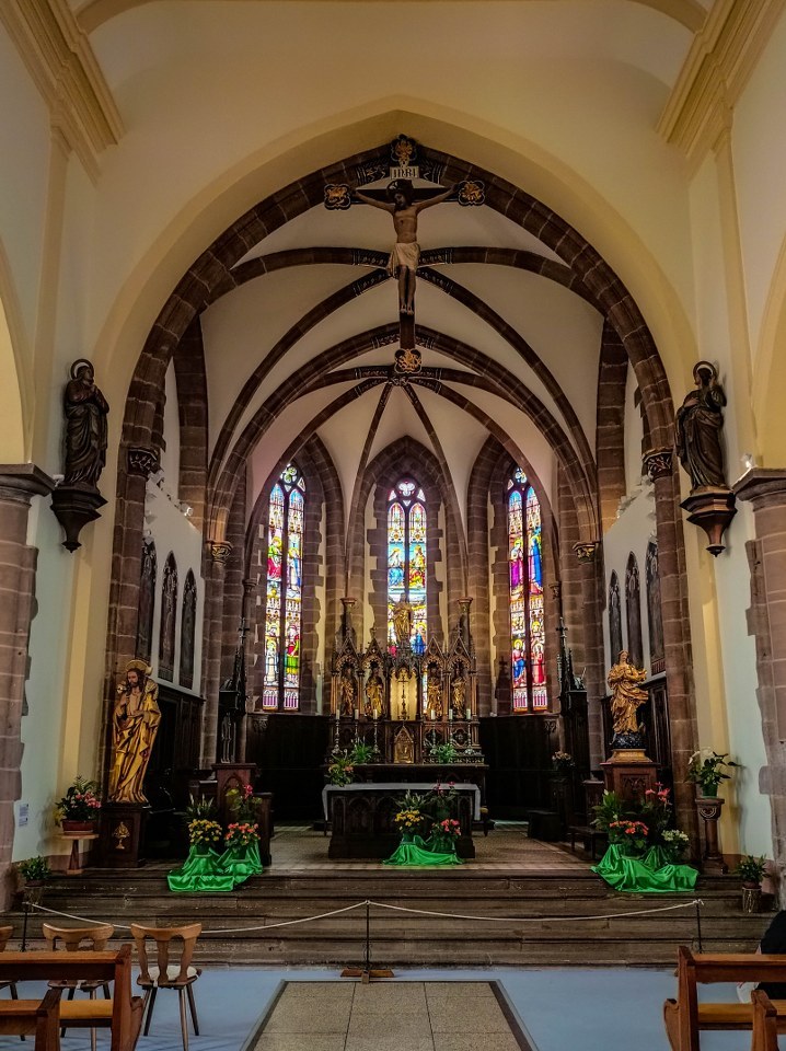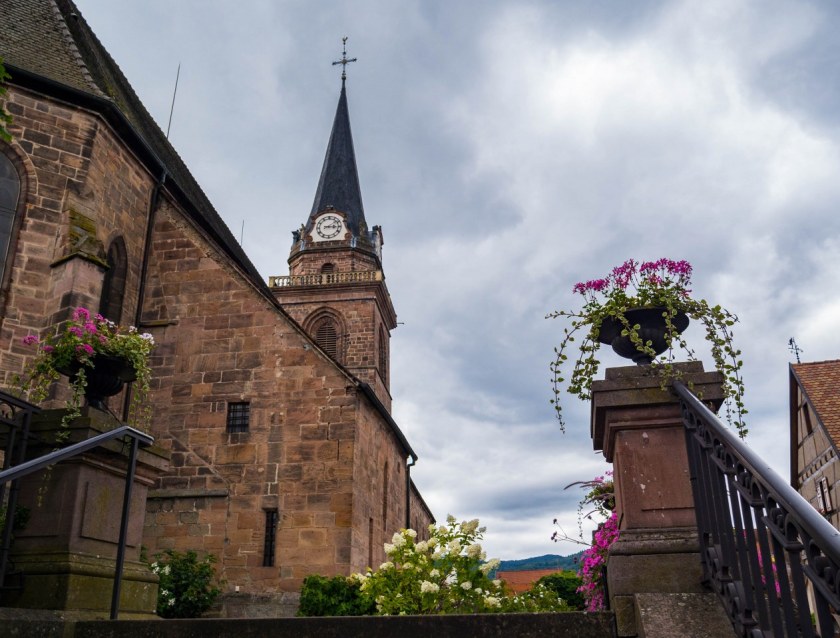 Co bardzo cenię w alzackich miasteczkach to fakt, że chcąc zobaczyć tamtejsze kościoły szansa na odbicie się od zamkniętych bram jest dość niewielka. I tutaj, położony na wschodnim krańcu wsi kościół Wniebowzięcia Najświętszej Maryi Panny stał otwarty. Ciekawa to budowla, o proweniencji średniowiecznej. Gotycka świątynia z czerwonego piaskowca powstała na miejscu starszego romańskiego kościółka, przez setki lat przechodziła przeto wiele remontów, a to z powodu zniszczeń wojennych jak i pożarów.