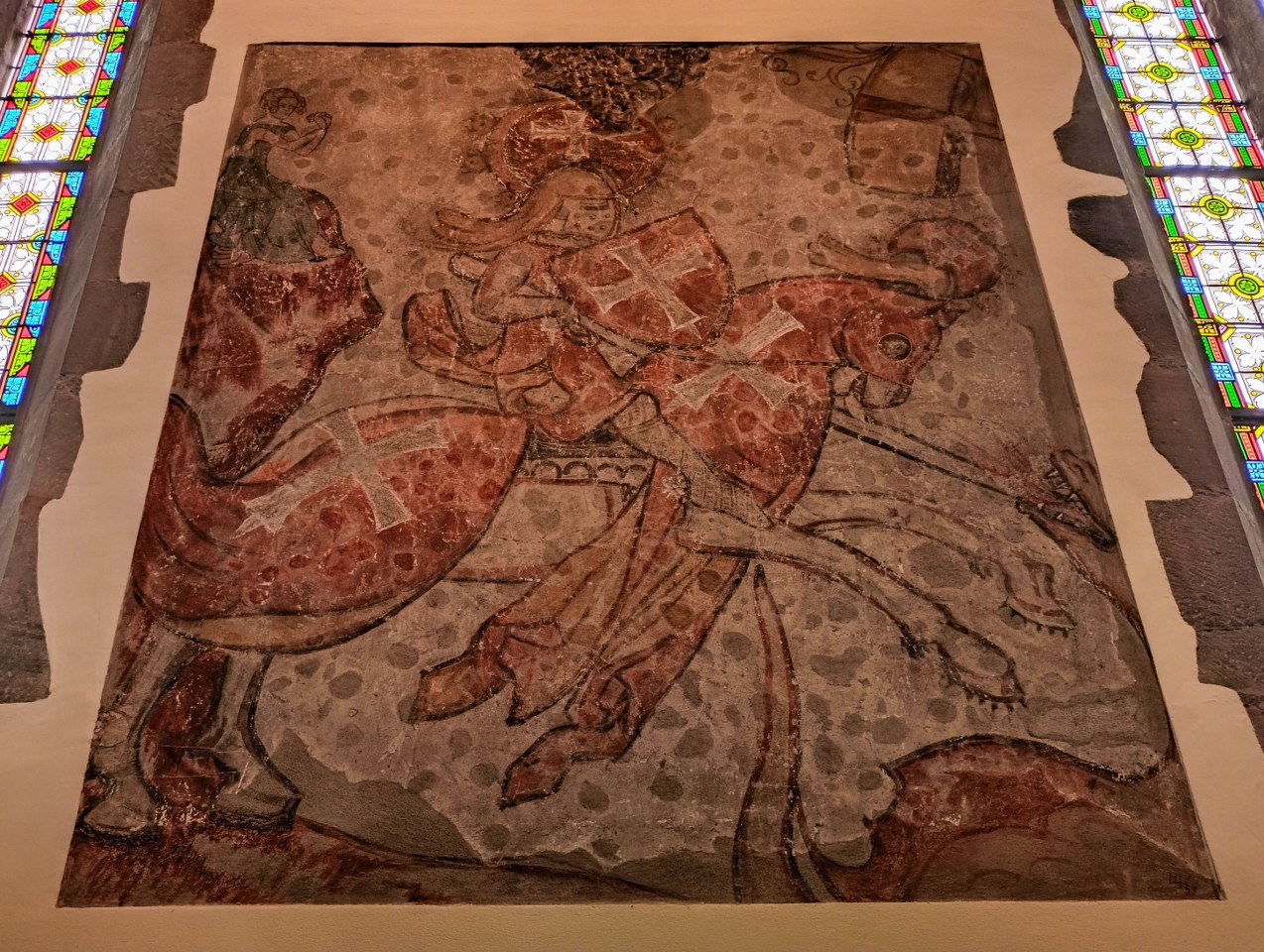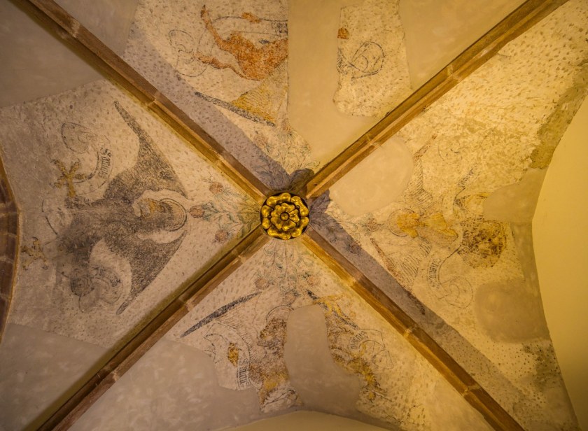 Dzięki temu dzisiejsza postać wciąż w gotyku jest najsilniej zakorzeniona, ale bez problemu da się odnaleźć elementy barokowe czy przede wszystkim klasycystyczne. Spacerując wokół i wewnątrz kościoła zwróćcie uwagę choćby na średniowieczne freski, tak ścienne (przedstawiające Św. Jerzego w wersji full templariuszowej, co wedle mądrzejszych ode mnie nawiązuje do czasów II Krucjaty kiedy to zakon miał we wsi swą placówkę) jak i te na sklepieniach z czterema ewangelistami; a z zewnątrz jedyny – polegając na źródłach – portal z tympanonem przedstawiającym Pokłon Trzech Króli.