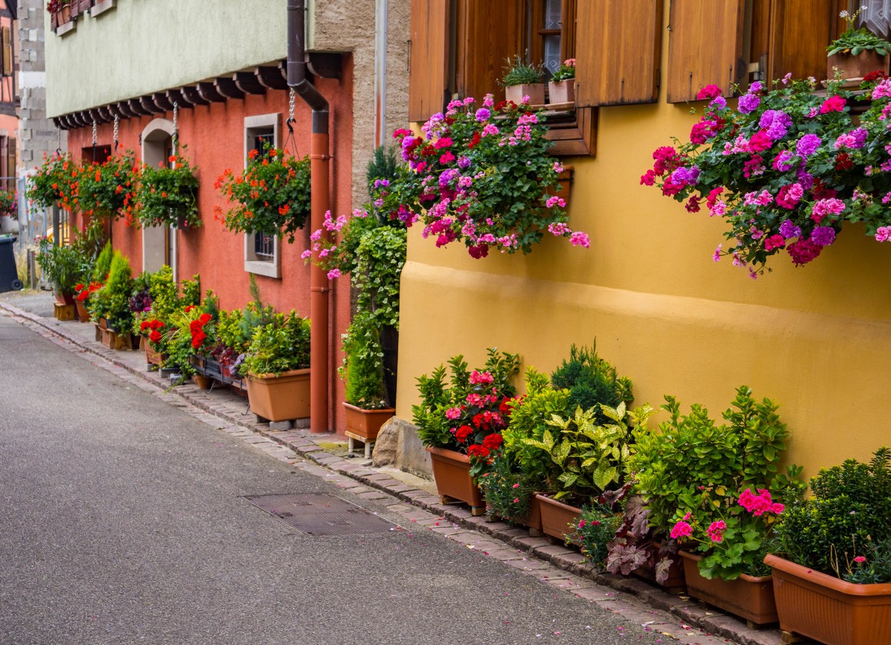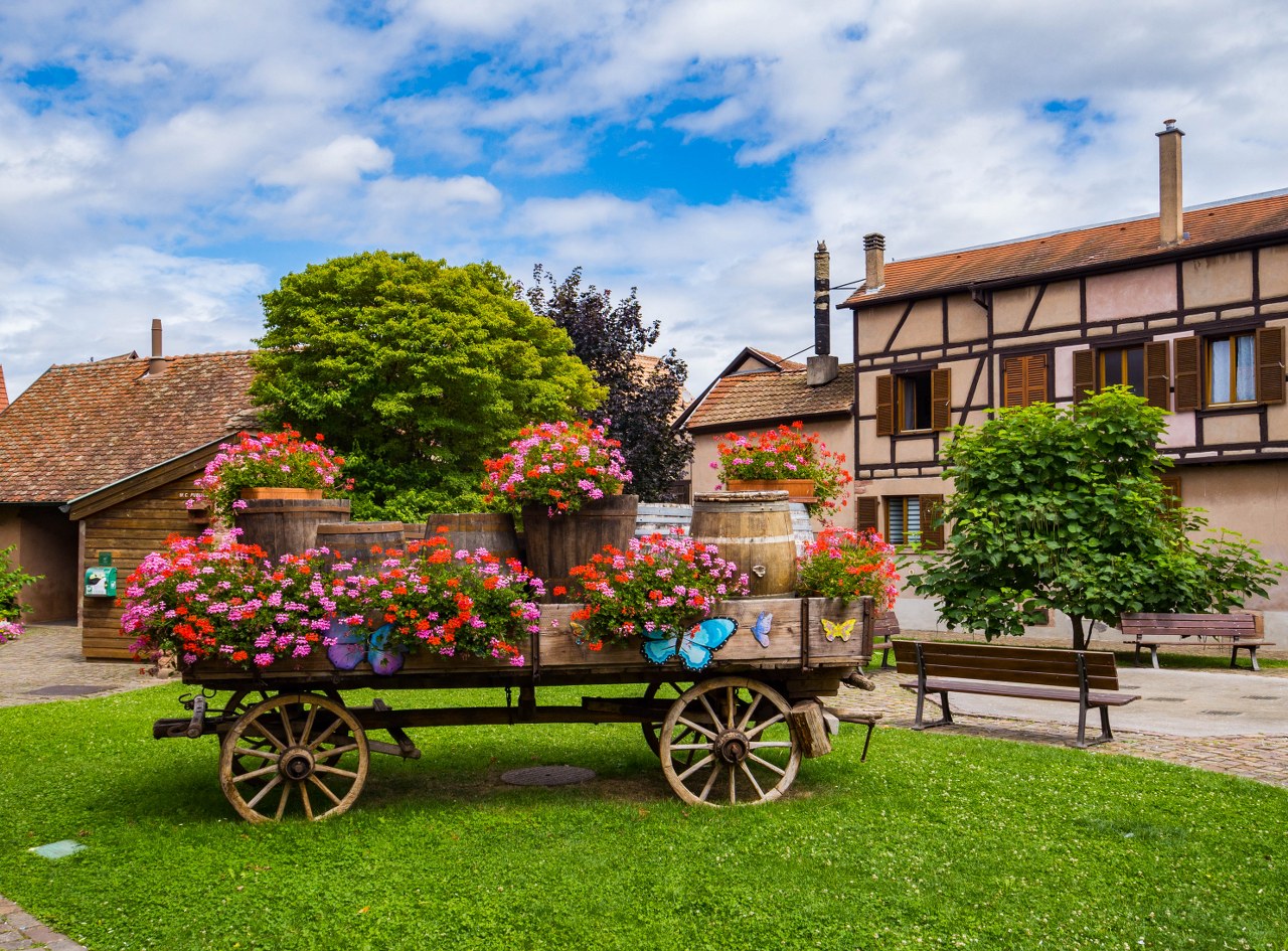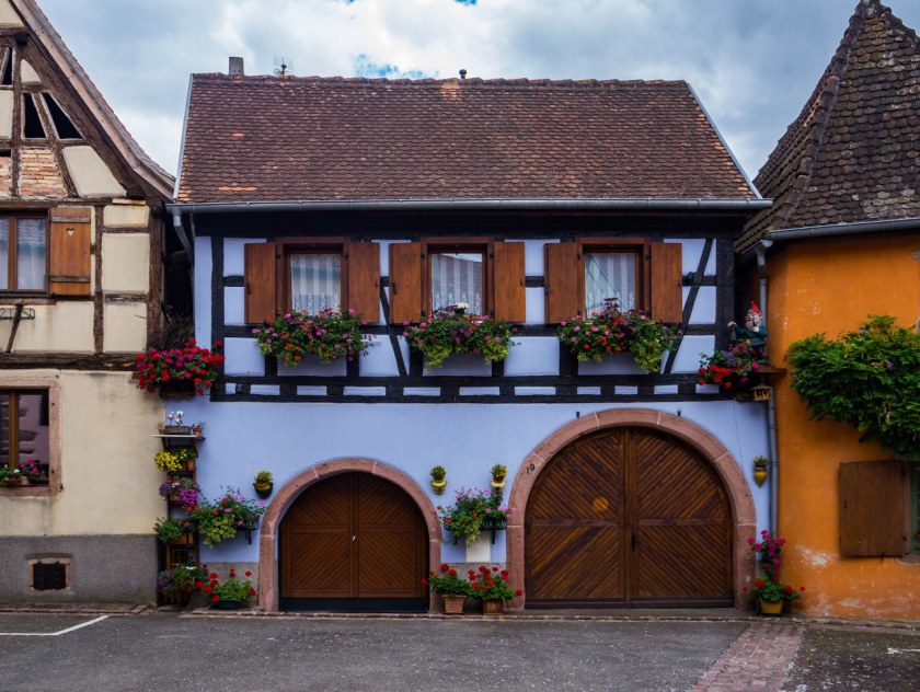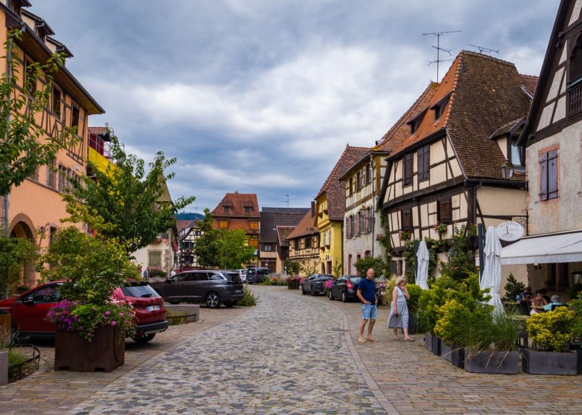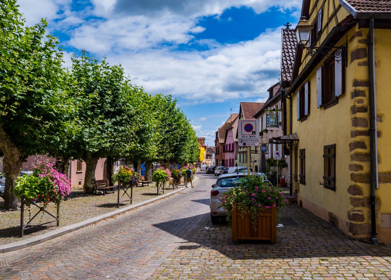 Bergheim nie jest wsią skomplikowaną w nawigacji, przebiega przez nią jedna długa na 550 metrów główna ulica, dwie mniejsze równolegle a wszystkie one poprzecinane są kilkoma kolejnymi prostopadłymi. Zgubić się nie można, ale warto spróbować zajrzeć w każdy kąt – Bergheim jest bowiem niesamowicie więc urokliwe (nowość w Alzacji, prawda?). Ogromna w tym zasługa kwiatów, olbrzymiej ilości kwiatów, jak i całkiem nieoczywistych rozwiązań jak i krótka (ale jednak) alejka platanów.