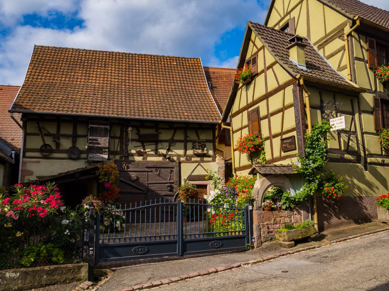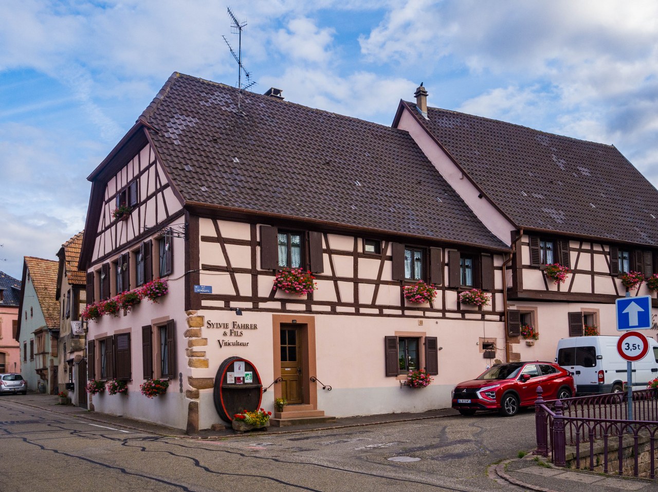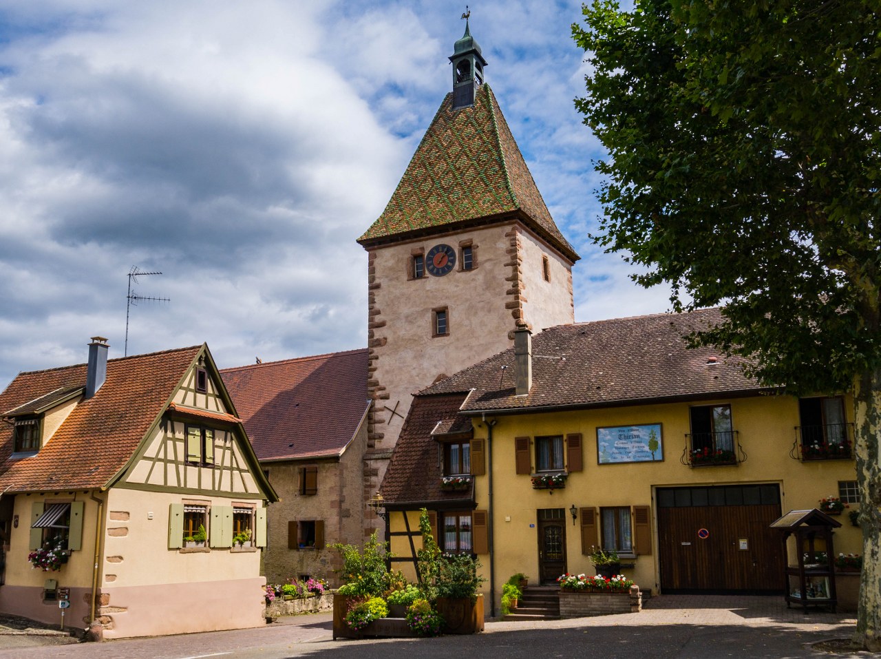 Bergheim nie jest wsią skomplikowaną w nawigacji, przebiega przez nią jedna długa na 550 metrów główna ulica, dwie mniejsze równolegle a wszystkie one poprzecinane są kilkoma kolejnymi prostopadłymi. Zgubić się nie można, ale warto spróbować zajrzeć w każdy kąt – Bergheim jest bowiem niesamowicie więc urokliwe (nowość w Alzacji, prawda?). Ogromna w tym zasługa kwiatów, olbrzymiej ilości kwiatów, jak i całkiem nieoczywistych rozwiązań jak i krótka (ale jednak) alejka platanów.