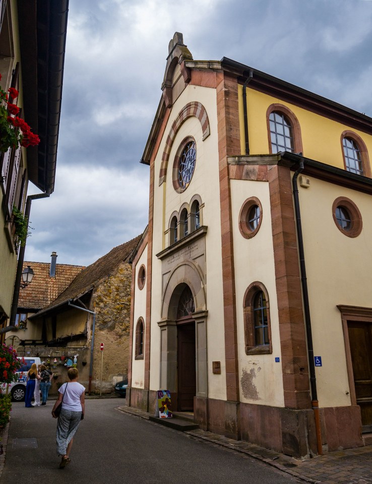 Tuż za przysłowiowym rogiem znajdziecie niewielką synagogę, dawną synagogę znaczy się, dziś centrum kulturowo-wystawiennicze. Społeczność żydowska w Bergheim należała swego czasu do jednej z największych w Alzacji, lecz wydarzenia II Wojny Światowej jak w wielu miejscach przyniosła jej kres. Od 30 przeszło lat – kiedy to świątynię zamknięto i nadano jej nowe funkcje – odbywają się w niej różnego rodzaju wystawy i seminaria, podczas mojej wizyty można było obejrzeć odtworzone fragmenty 1:1 sławnej Mozaiki z Bergheim, jednego z najważniejszych rzymskich artefaktów odnalezionych w całej Alzacji. Wnętrza są dziś dość skromne, ale i tak warto zajrzeć, być może będziecie mieć szansę wejść na empory, gdzie niegdyś znajdowały się babińce, czyli fragmenty synagogi wydzielone dla kobiet chcących uczestniczyć w nabożeństwie.