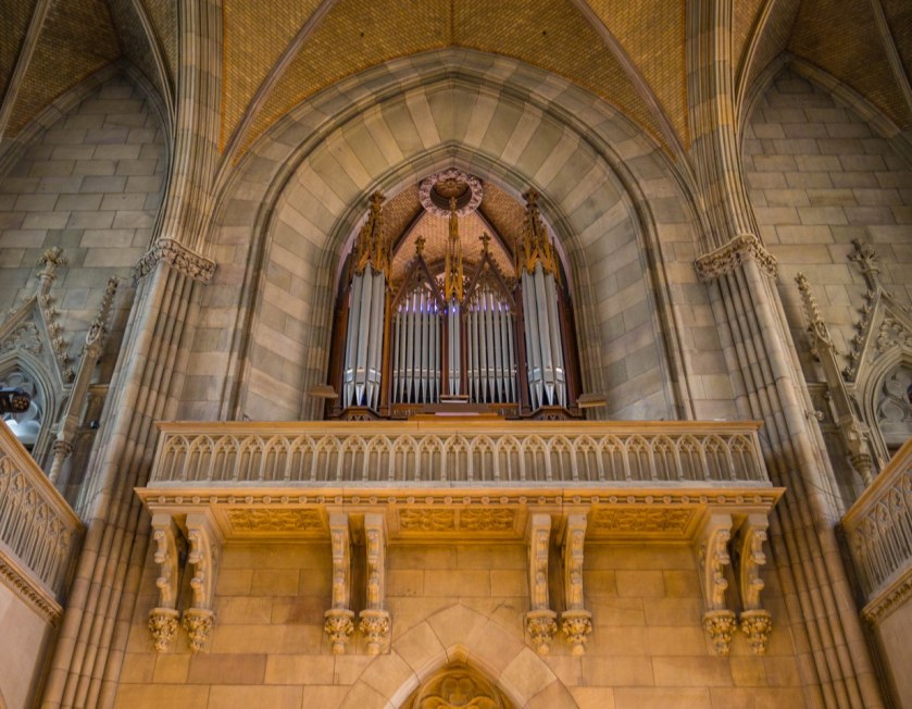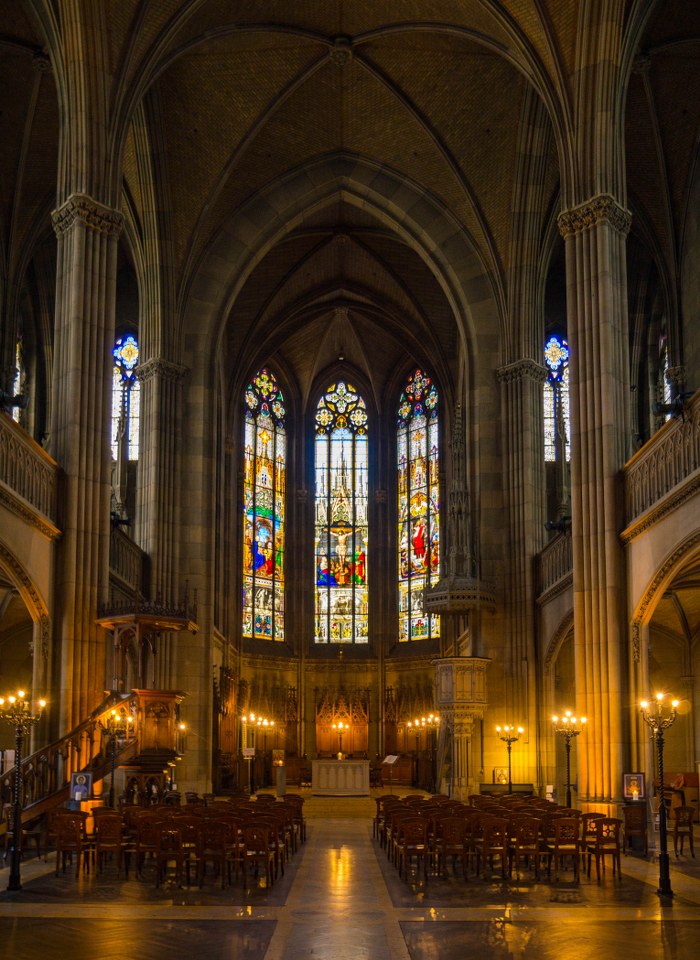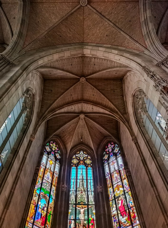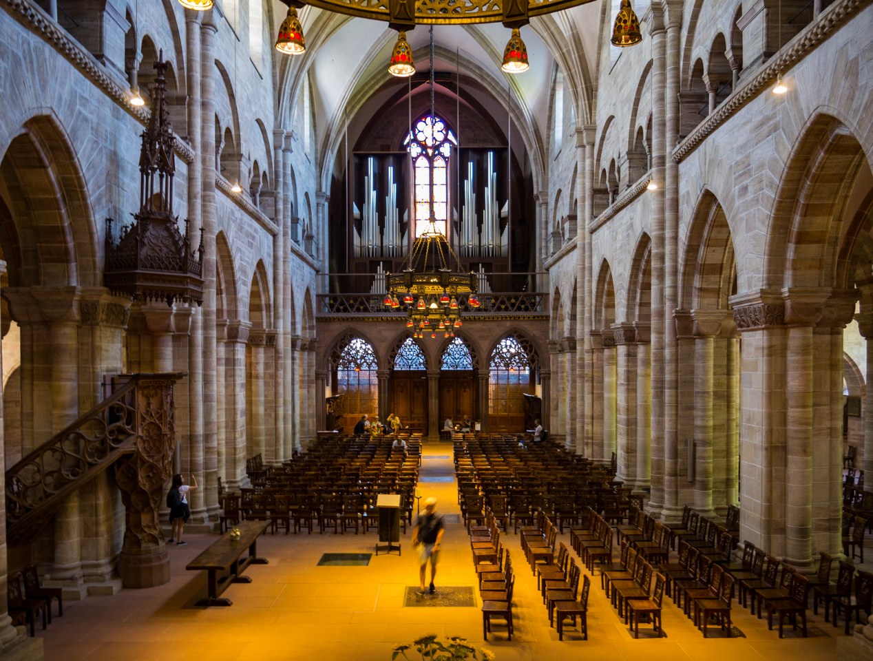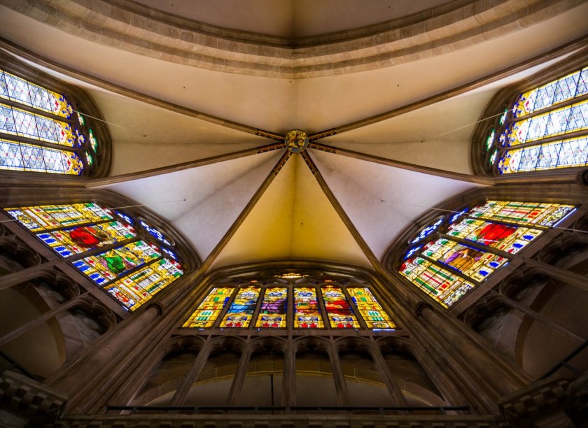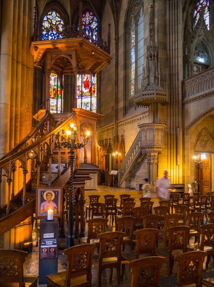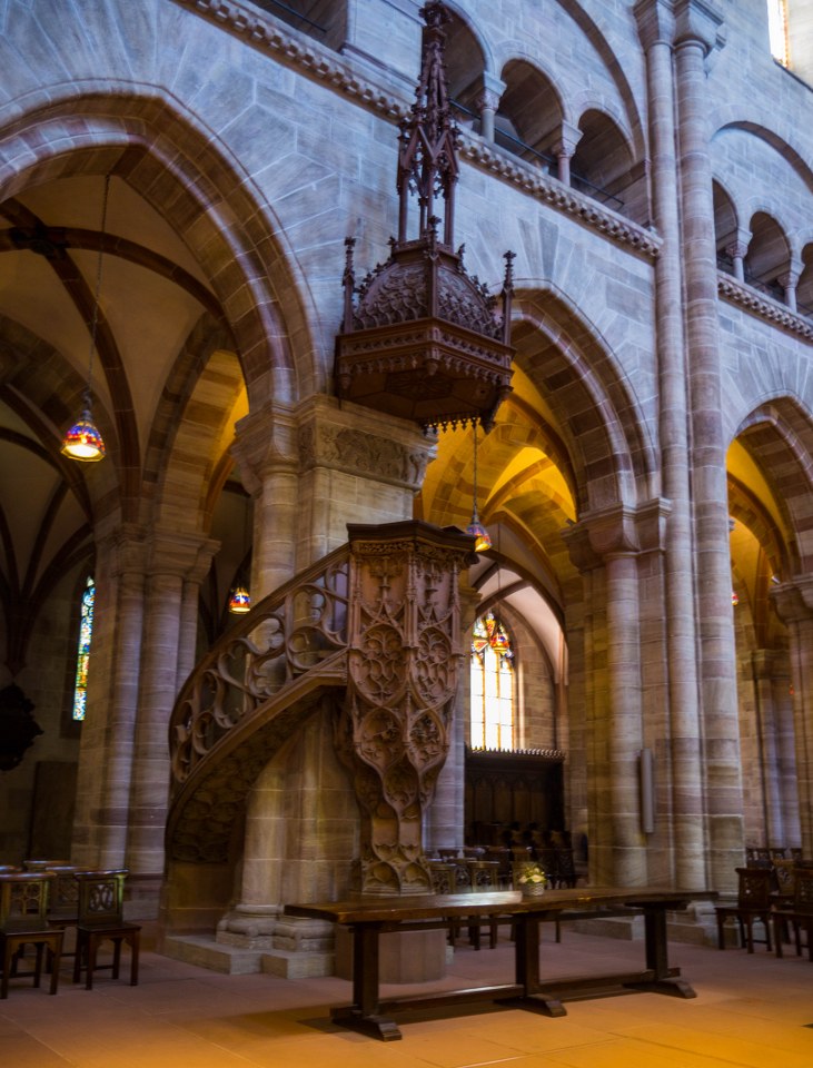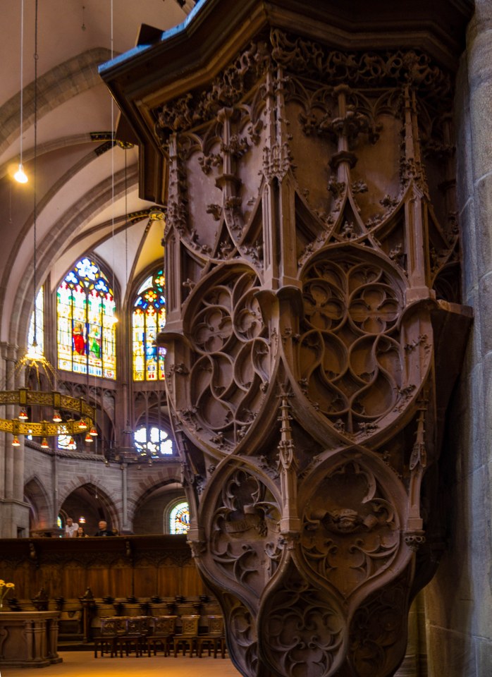 Dziś nasze zmysły zajmują kolumny, łuki, sklepienia, triforia, niezwykle wyszukana i pełna detali kamienna ambona. Temu kamiennemu właśnie monolitowi i delikatnym drobnym drewnianym krzesłom kolorytu nadają XIX-wieczne witraże. Wnętrza są niezwykle plastyczne dlatego też nie zdziwił mnie widok lekcji rysunku i młodych ludzi w skupieniu szkicujących elementy nawy głównej i prezbiterium.