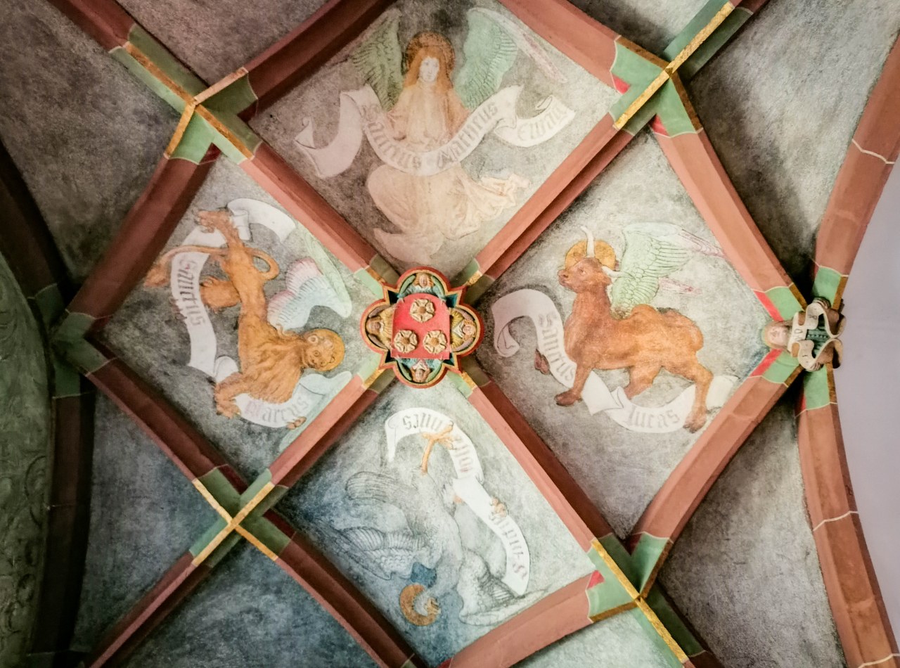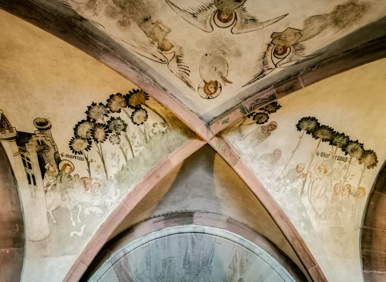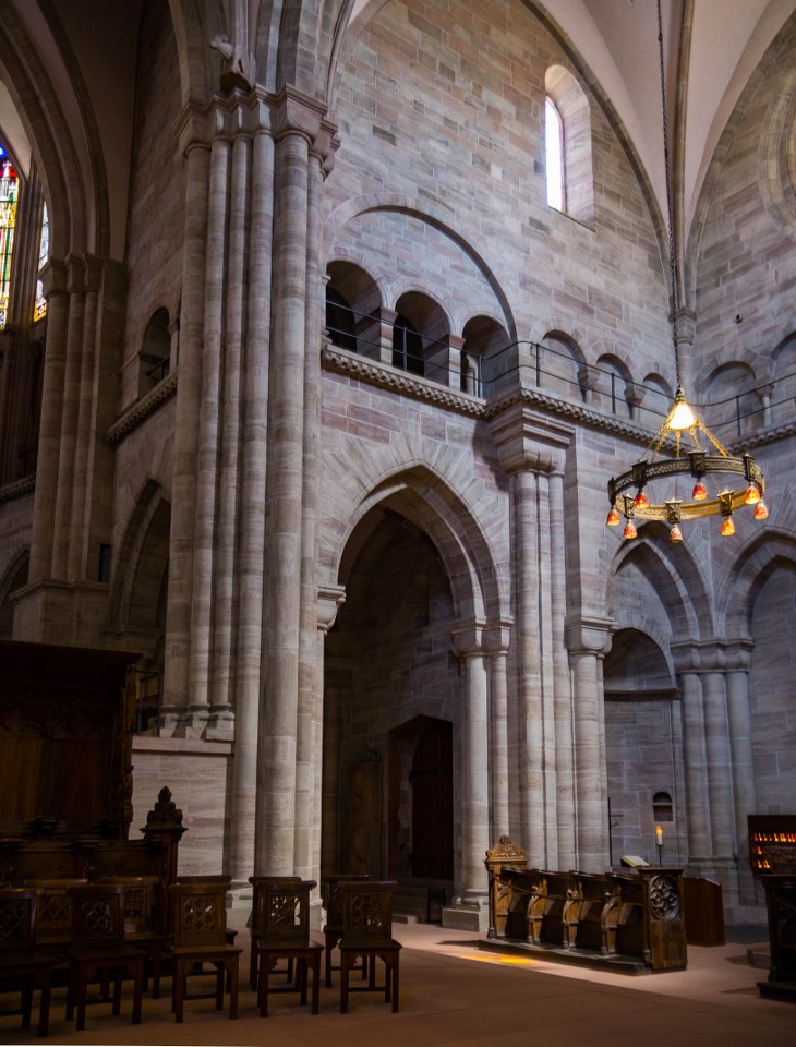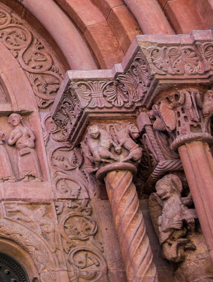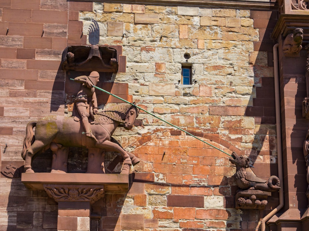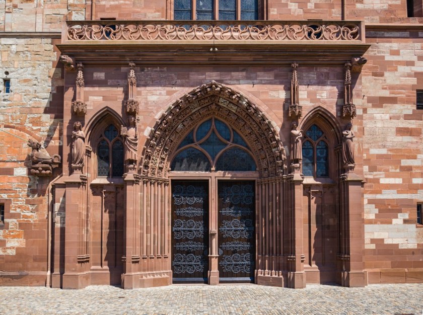 Bazylejska katedra jest jak ogr i składają się nań warstwy poprzednich świątyń, Portal Gallusa pochodzi z jednej z nich, powstał po pożarze w XII-wieku i mówi się, że jego historia sięga 1185 roku! Co jest dość niesamowite i pokazuje, kunszt ówczesnych rzemieślników – zwróćcie uwagę na szczegóły i mnogość postaci i dekoracji, kapitele wieńczące kolumny, groteskowe stwory, aniołowie grający leniwie ubierającym się zmartwychwstałym, przedstawienie kolejnych scen z Biblii, tympanon z Jezusem, ale i Pannami Mądrymi i Głupimi. Jeśli macie czas to pokontemplujcie tu sobie.