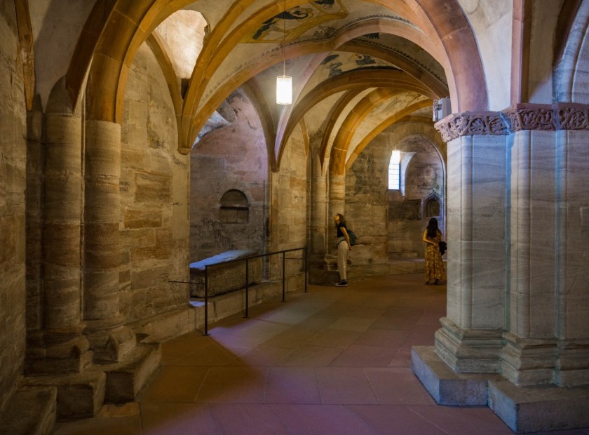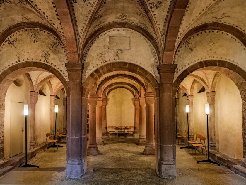 W najstarszej części kościoła, znajdujących się pod prezbiterium kryptach spoczywają biskupi, ci z najdalszej przeszłości i nawet sprzed niemal tysiąca lat. Romańskie podziemia wypełnione są pozostałościami po dawnych malowidłach. Niektóre ledwo widoczne, inne w trakcie renowacji a kilka już całkowicie odnowionych.