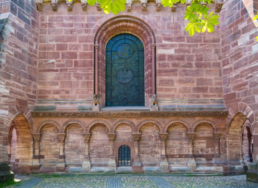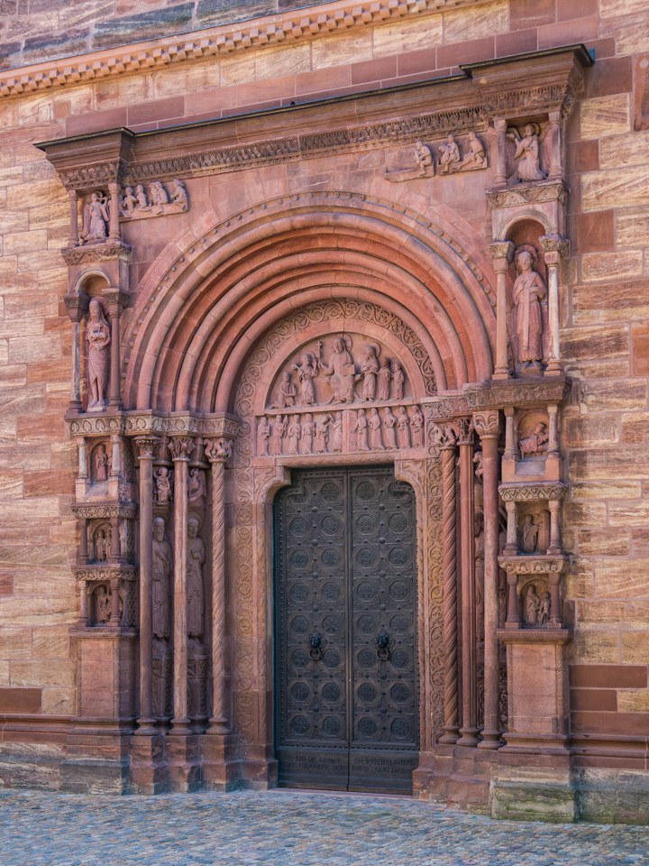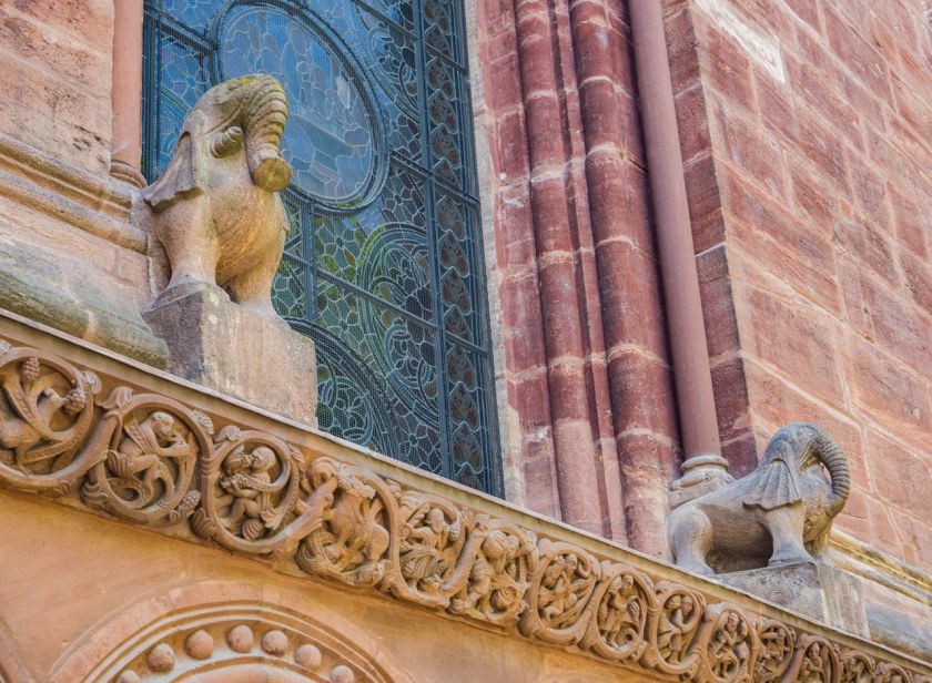 O historii, wszystkich byłych i obecnych artefaktach oraz architekturze kościoła można by napisać książkę (ba, taka powstała) dlatego by was nie zanudzić zrobimy tylko sprint po tym co wydaje mi się najważniejsze. Po pierwsze: zewnętrzne cuda z czerwonego piaskowca czyli w zasadzie cała bryła ukształtowana na planie bazyliki z transeptem, i dwoma okazałymi gotyckimi wieżami. Przypisani do każdej z wież święci (Jerzy i Marcin) otrzymali na zachodniej elewacji imponujące posągi, tworząc z rozbudowanym portalem bardzo ciekawą kompozycję. Zadanie za 5 pkt jak będzie na miejscu: rzućcie okiem na jegomościa po prawej stronie portalu, przyjrzyjcie jego plecom i zgadnijcie kto to.