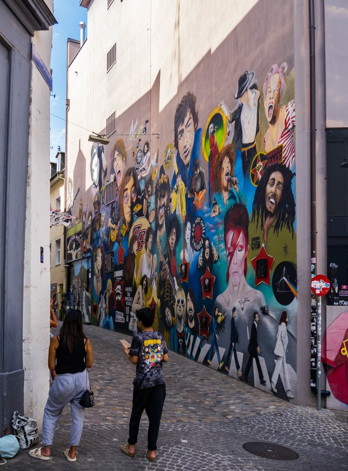 Jeśli zawędrujecie w te rewiry po polecam też, zajrzeć na nieodległą (naprawdę) Gerbergasslein, gdzie znajduje się jeden z bardziej znanych bazylejskich murali, mural rockowy. Kogo tam nie ma, caluśka klasyka rocka… I szanuję pomysł, ale wykonanie jest z typu tych „kilka niedociągnięć jest”.