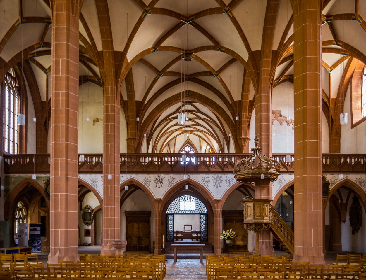 Wnętrza trójnawowego kościoła są dość wyjątkowe, niesamowicie oszczędne w wyposażeniu, acz dzięki imponującym gotyckim rozwiązaniom (i powidokach po świątyni romańskiej) zajmujące. I momentami tak niepokojąco wręcz sterylne, że wyglądają niczym kadry wyjęte z jakiejś gry, na najwyższych ustawieniach grafiki. Czy taki stan rzeczy trwa nieprzerwanie od ikonoklastu w czasie Reformacji kiedy to zwolennicy Huldrycha Zwingliego wtargnęli do świątyni i zniszczyli większość znajdującego się tam wyposażenia i dekoracji? Możliwe.