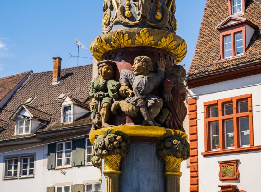 Ruszając spod dworca zwróćcie uwagę na Pomnik Starsburski, swego rodzaju symboliczny pomost do odwiedzanej wcześniej Alzacji. Piękny pomnik z marmuru karraryjskiego, dzieło znanego nam Frederica Augusta Bartholdy’ego jest podziękowaniem dla Bazylei i jej mieszkańców za pomoc jakiej w 1870 roku udzielili obleganemu przez pruskie wojska Strasburgowi. W maciupkim parku zaraz obok trafiamy na pierwszą z naprawdę wielu miejskich fontann, w tym przypadku mały brzdąc maltretuje gęś tak jak Boetos z Chalkedonu przykazał.