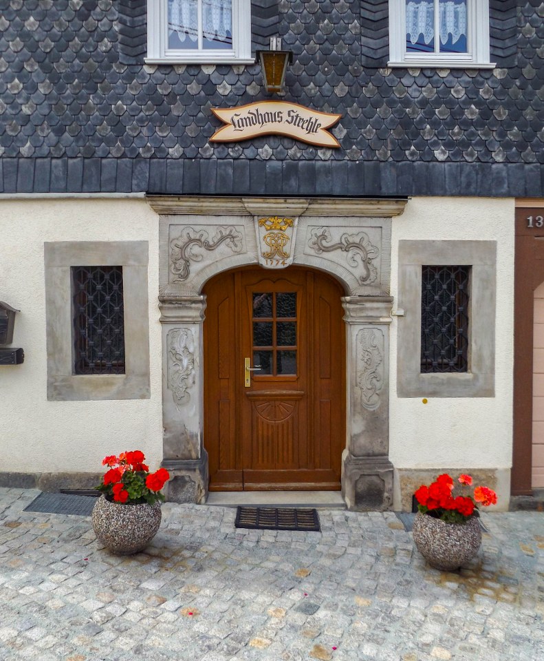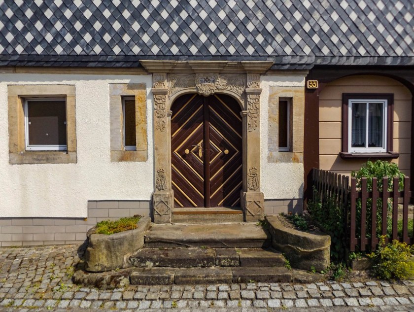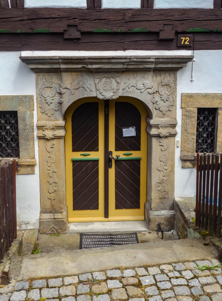 Działalność dawnych kamieniołomów (były dwa, jeden pod Luzem, drugi obok na Sonnebergu) widać tu na niemal co drugim obejściu. Wiekowe, nierzadko misterne portale z miejscowego piaskowca zdradzają majętność właścicieli, a kunszt rokokowych i barokowych rzemieślników zabiera nas w podróż nawet i do XVII czy XVIII stulecia. Inne ważne, choć nie rzucające się tak w oczy wykorzystanie miejscowego piaskowca zobaczycie w tutejszym Muzeum Młynarstwa w postaci kamieni młyńskich. My nie zobaczyliśmy bo też muzeum otwarte jest dość niefortunnie tylko w trzy dni tygodnia: środę i sobotę od 10:00 do 12:00 i w sobotę od 10:00 do 16:00.